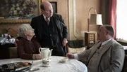 Die Himmelsleiter - Sehnsucht nach MorgenDer Ex-Parteibonze Armin Zettler (Axel Prahl, re) zieht Heinrich (Jürgen Schornagel) und Clara Breinig (Ilse Strambowski) über den Tisch.Bild: © ARD Degeto/Stephanie Kulbach