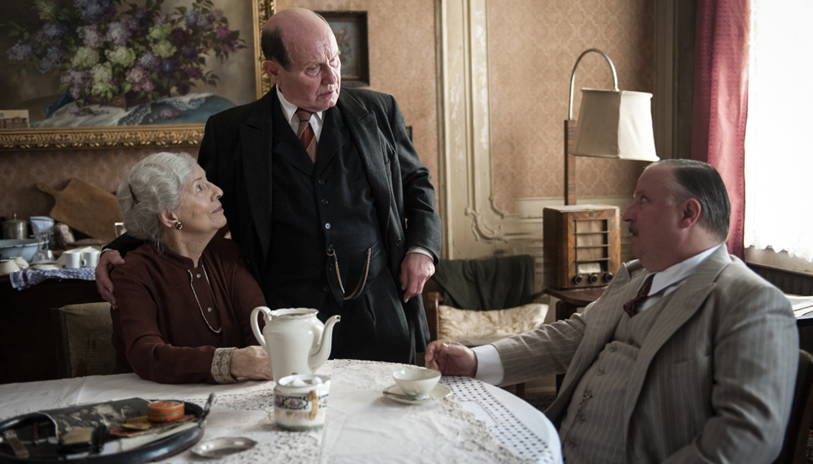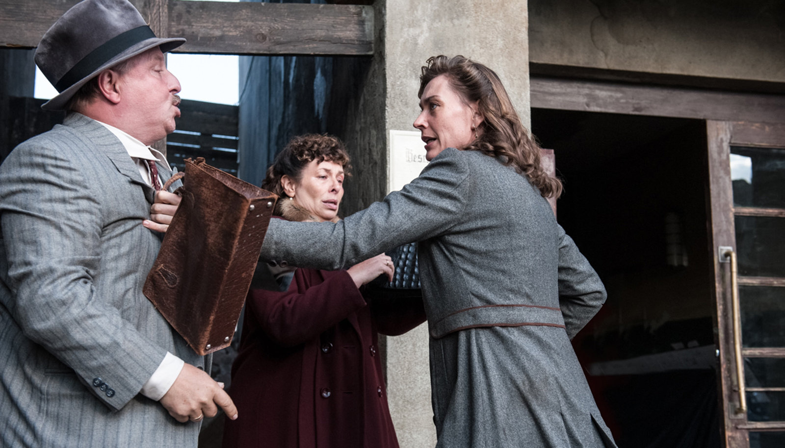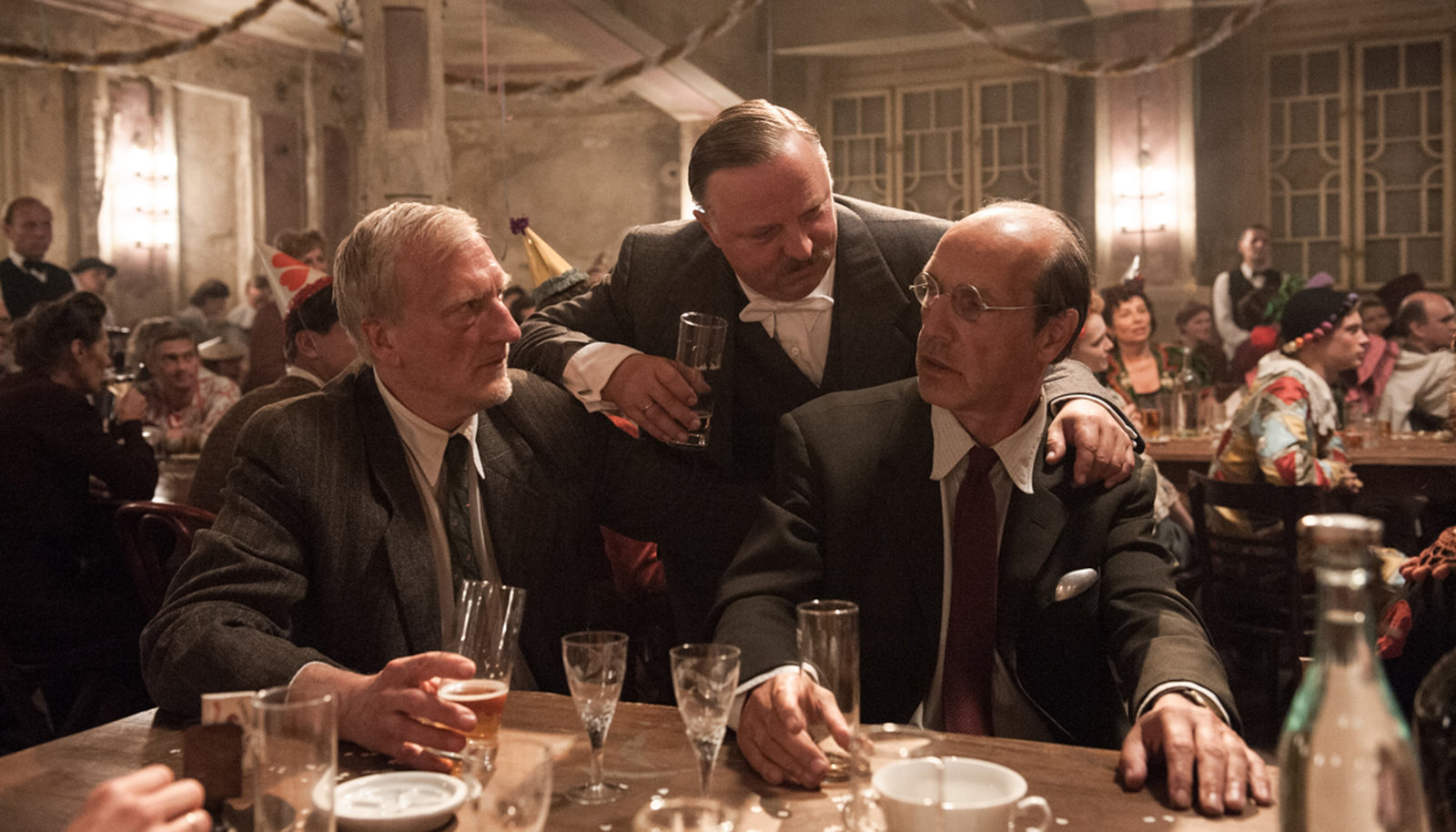 Teil 2Der leutselige Nazi Zettler (Axel Prahl, M) will beim Karneval die gute Stimmung ausnutzen und sich mit den Juden Adam (Ernst Stötzner, l) und Josef Rogowski (Thomas Bestvater) aussöhnen. Die beiden sind nicht amüsiert.Bild: © WDR/ARD Degeto/Stephanie Kulbach