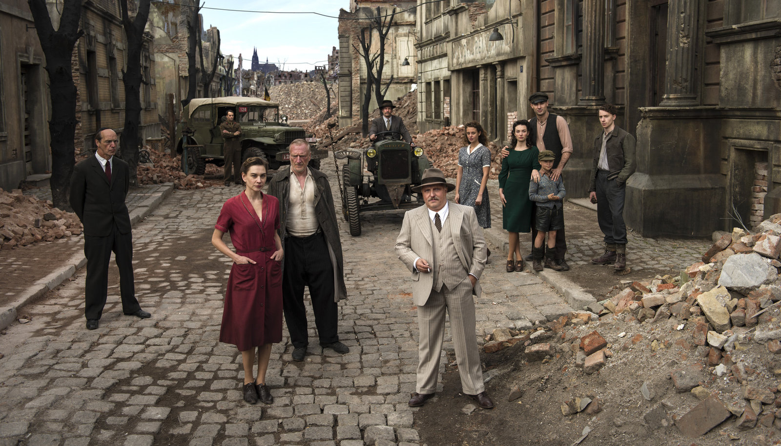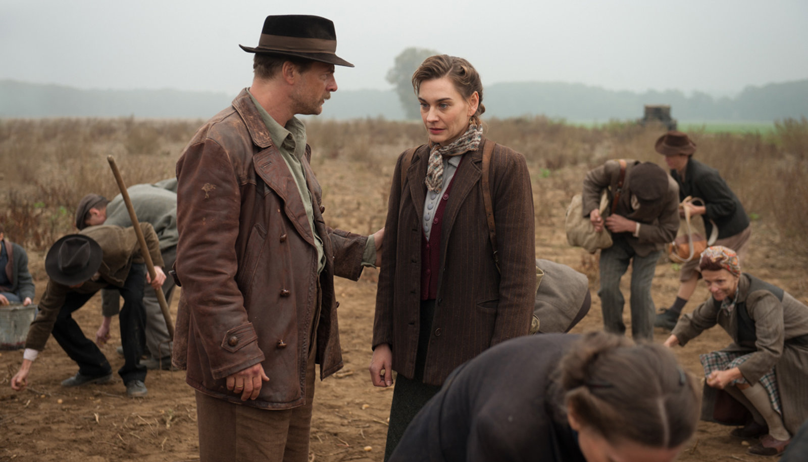 Teil 1Von links nach rechts: der Bauer Josef Halfen (Henning Baum, vorne li.), Michel (Jonathan Berlin, hinten li.), Josef Rogowski (Thomas Bestvater), Anna Roth (Christiane Paul), ihr Mann Adam (Ernst Stötzner), Sophie Roth (Sarah Horvath), Sophies Mann Francesco Grasso (Adam Vacula), Sophies Sohn Paul (Luis Vorbach), Eva Roth (Muriel Wimmer) und der belgische Soldat René Valmund (Nikolai Kinski).Bild: © ARD Degeto/Stephanie Kulbach