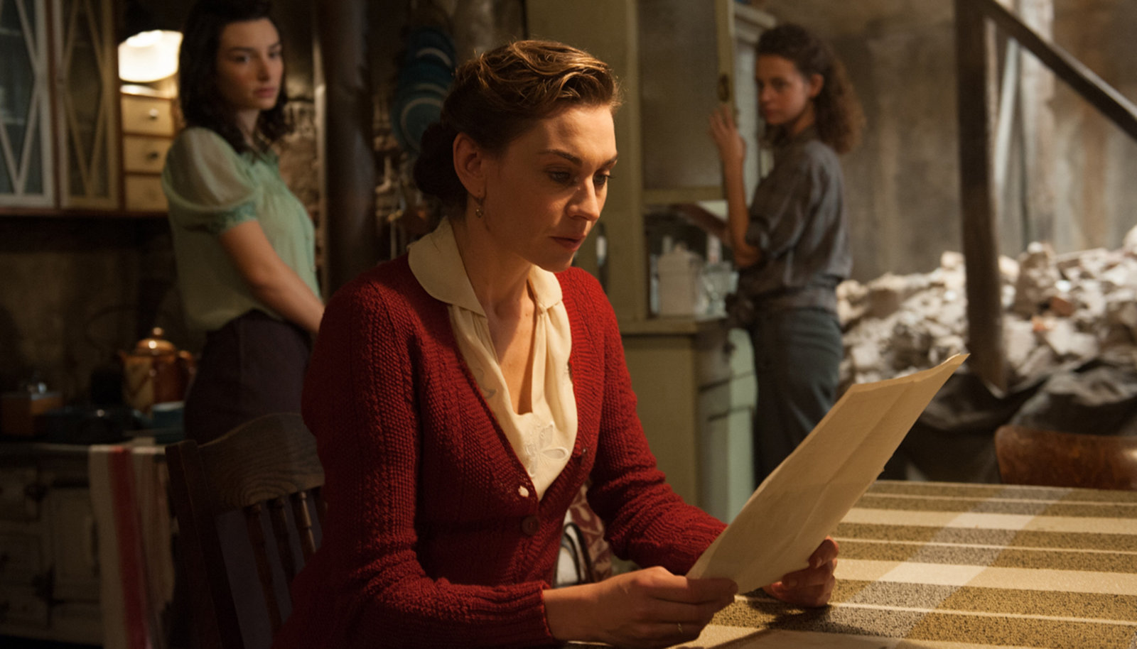 Teil 1Anna (Christiane Paul, M) und ihre beiden Töchter Eva (Muriel Wimmer, r.) und Sophie (Sarah Horvath) erfahren, dass sie beim Spruchkammerverfahren als Zeugen aussagen sollen.Bild: © WDR/Degeto/Stephanie Kulbach