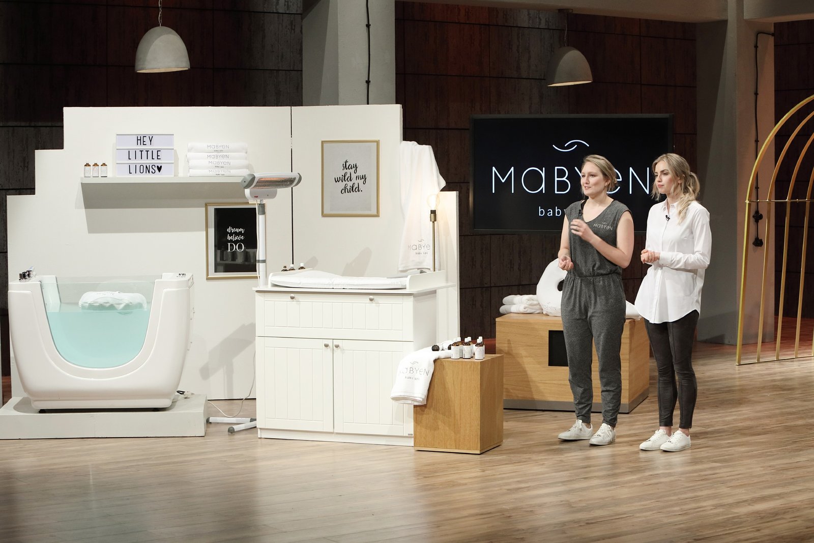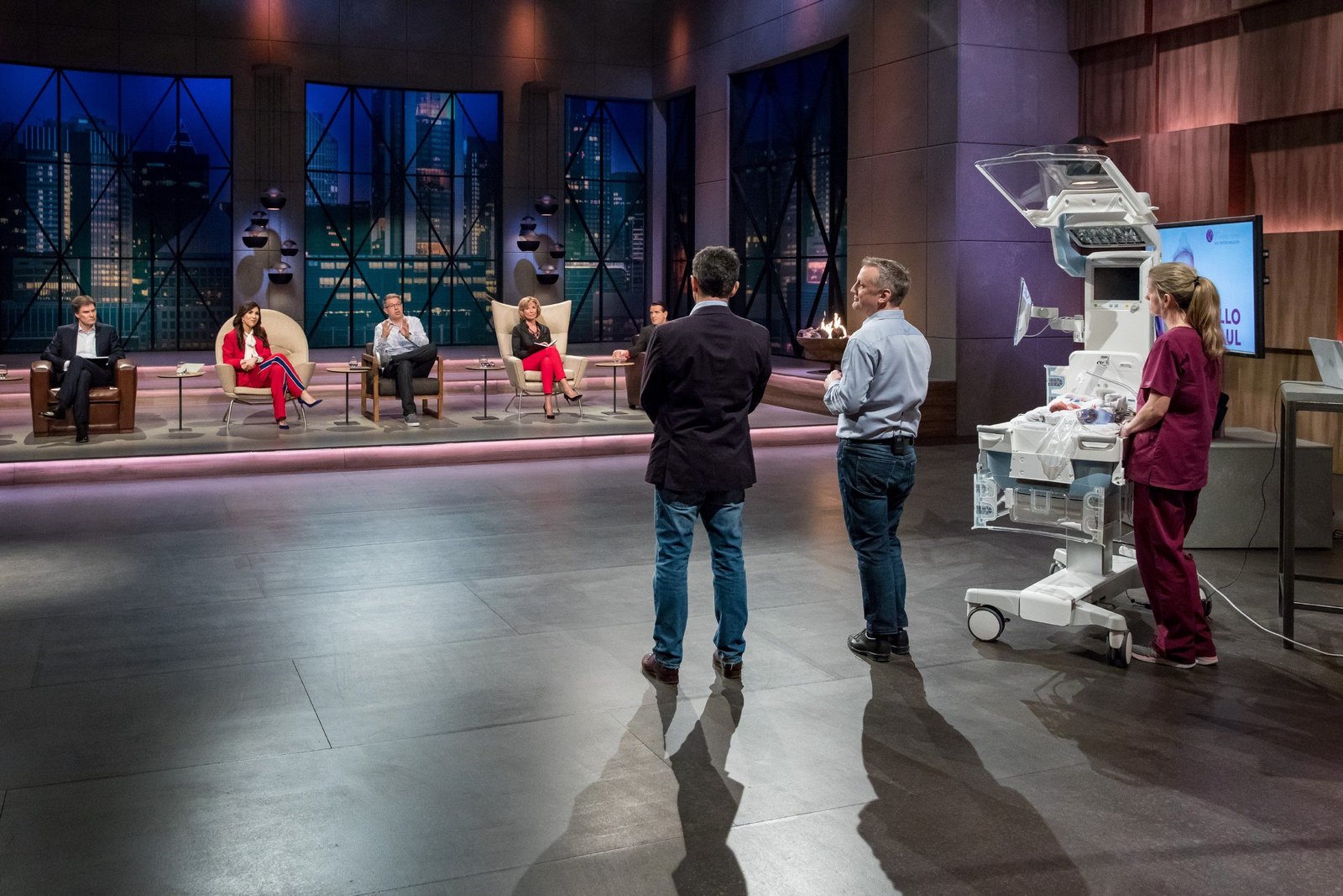 Folge 3Dr. Jens Schwindt (l.) und Mag. Michael Hoffmann präsentieren den "Löwen" (v.l.) Carsten Maschmeyer, Judith Williams, Frank Thelen, Dagmar Wöhrl und Ralf Dümmel mit "Sim Characters" den medizinischen Frühgeborenensimulator "Paul". Sie erhoffen sich ein Investment von 1 Million Euro für 10 Prozent der Anteile an ihrem Unternehmen.Bild: © MG RTL D / Bernd-Michael M