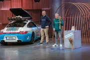 Folge 7Nils Freyberg (l.) und Tiado Janis Pieperhoff aus Dortmund präsentieren mit _ASPHALTKIND_ eine Dachbox aus Naturfasern. Sie erhoffen sich ein Investment von 230.000 Euro für 15 Prozent der Anteile an ihrem Unternehmen.Bild: © RTL / Bernd-Michael Maurer
