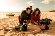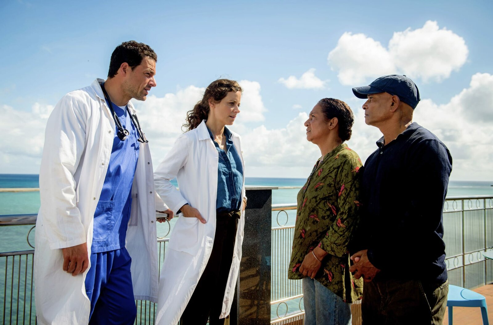 Notfall im ParadiesFilipa (Anja Knauer) behandelt im Beisein von Emi (Dennenesch Zoudé) und Kulovits (Helmut Zierl) Einheimische.Bild: © MDR/Degeto/Tivoli Film/Alexander Schumann