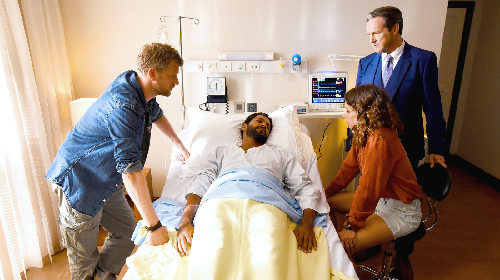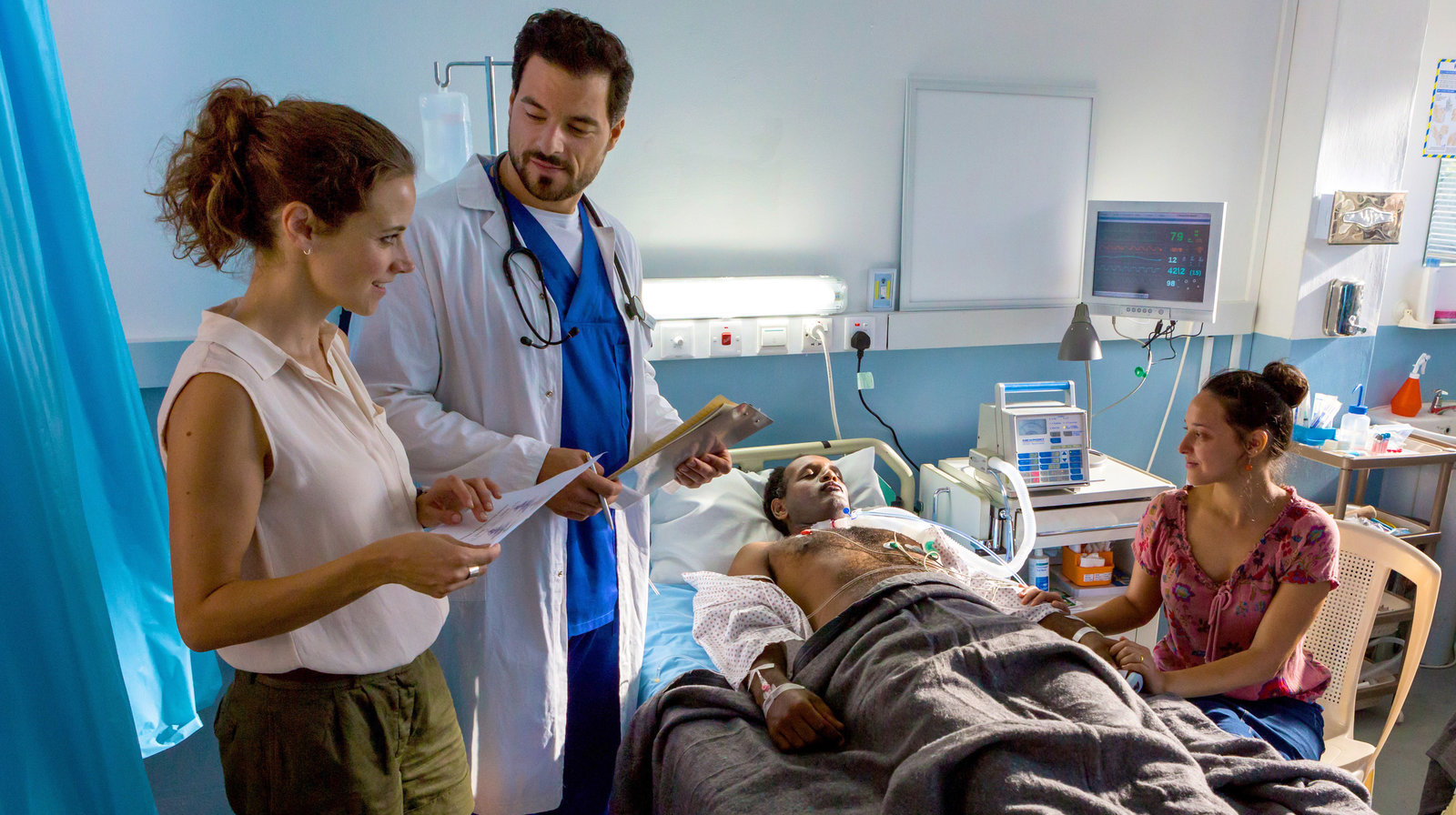 Neustart auf MauritiusFilipa (Anja Knauer) und Dr. Daniel Bucher (Tobias Licht) am Krankenbett von Jimmy (Selam Tadese). Seine Frau Lina (Diane Nuteau) macht sich große Sorgen.Bild: © HR/Degeto/Tivoli Film/Alexander Schumann