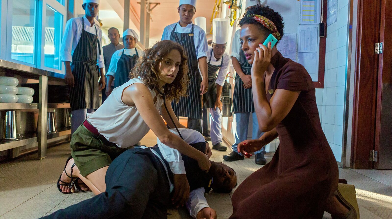 Neustart auf MauritiusEinsatz für Filipa (Anja Knauer): Der Kellner Jimmy (Selam Tadese) ist zusammengebrochen. Stella (Dennenesch Zoudé) ruft den Rettungswagen.Bild: © ARD Degeto/Tivoli Film/Diensen Pamben