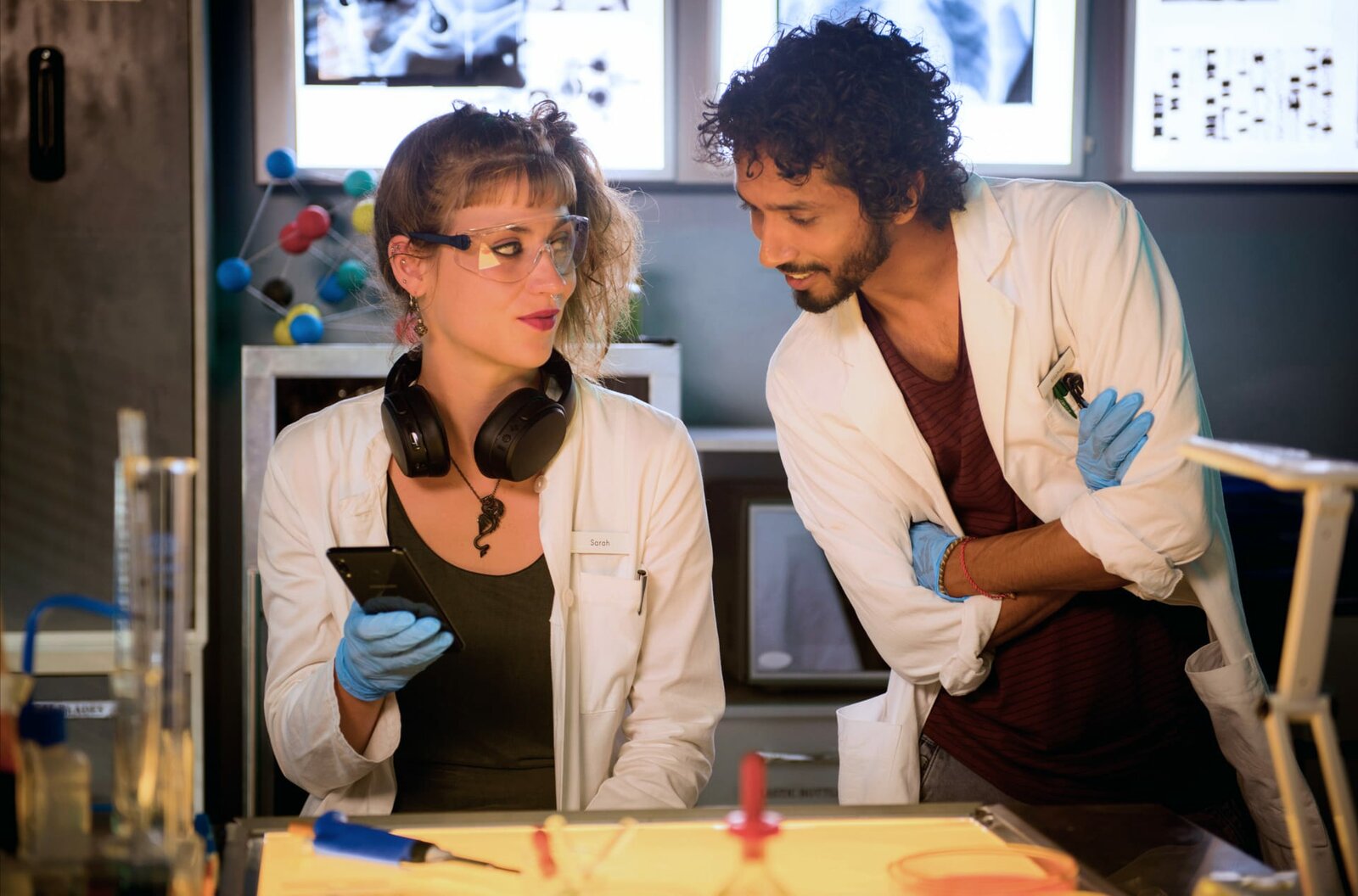Die MutprobeLabortechnikerin Sarah (Sophie Pfenningsdorf) und ihr Laborassistent Elahee (Edeen Bhugeloo) scherzen über ihren Modegeschmack.Bild: © ARD Degeto/Daniel Villiers