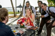 Das RätselNathalie (Anna Hausburg, Mitte) wird von Martins (Ole Fischer, li.) romantischen Heiratsantrag überrascht.Bild: © ARD Degeto