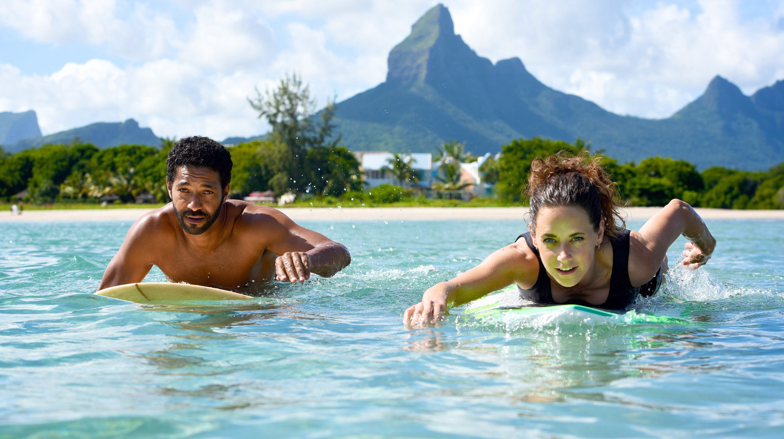 Neustart auf MauritiusSurfen nach Dienstschluss: Ärztin Dr. Filipa Wagner (Anja Knauer) mit dem Barkeeper Mike (Tyron Ricketts).Bild: © SWR/ARD Degeto/Tivoli Film/Alexander Schumann