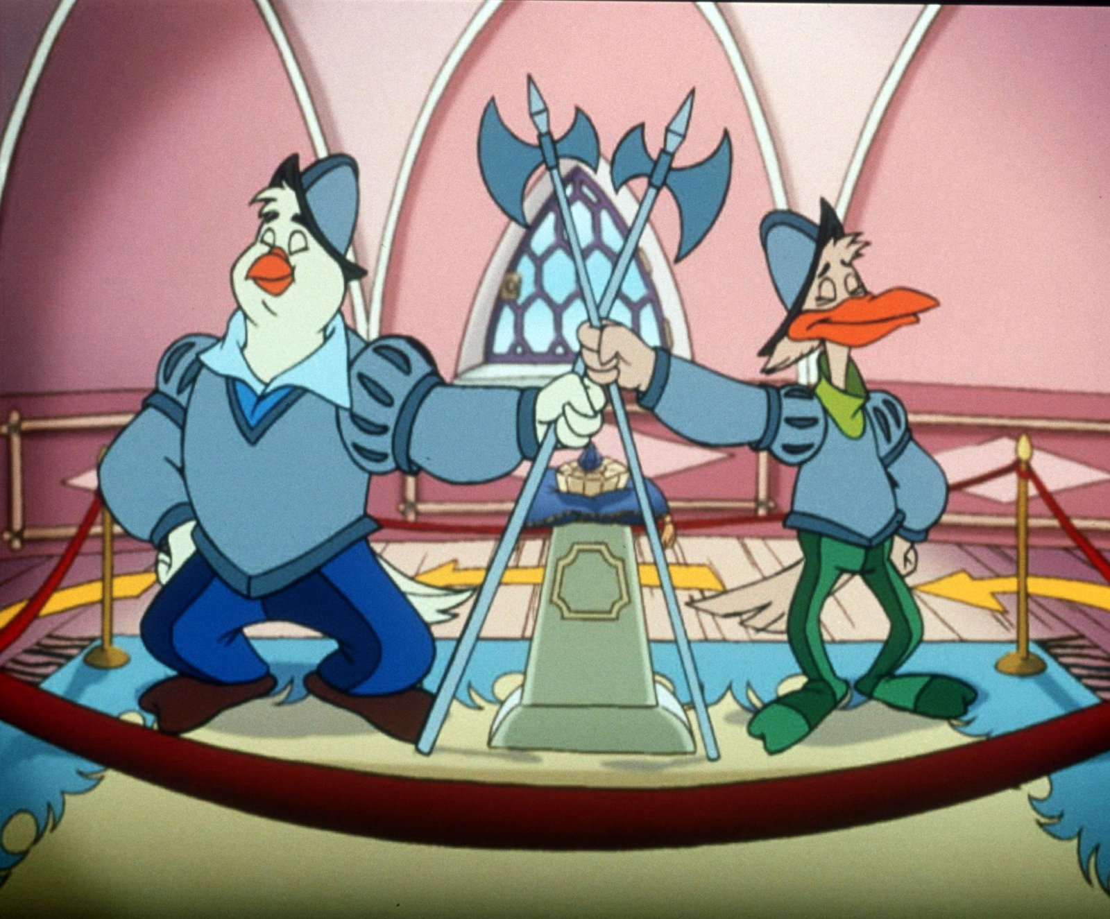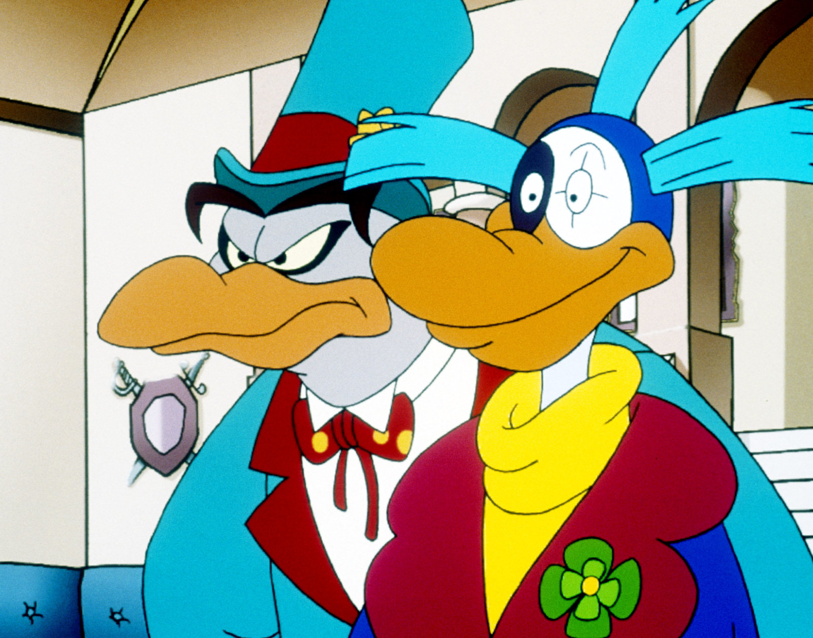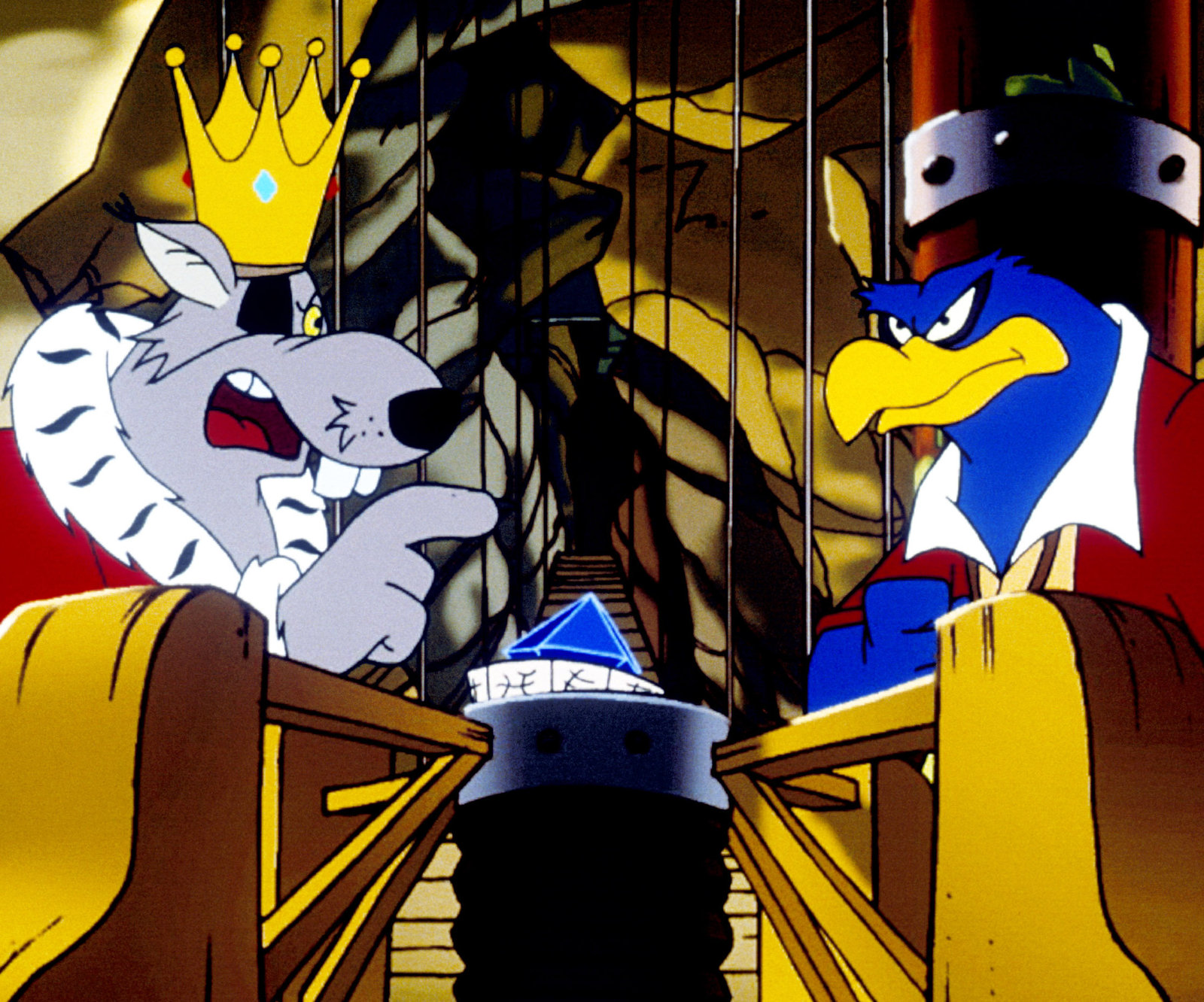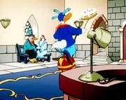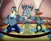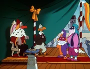 Die Statue"Die Jagd nach dem Kju Wang", "Die Statue." Ein Brief flattert in den Palast: Graf Yagor erlaubt sich untertänigst, Herzog Cirillo und Ardelia zur feierlichen Enthüllung einer Statue der beiden einzuladen. Mit dem Luftschiff fliegen sie also nach Rhondia, dem Sitz des Grafen Yagor. Aber Yagor wäre nicht Yagor, führte er nicht wieder etwas im Schilde, um an den kostbaren Kju Wang des Herzogs zu gelangen. Er hat den Rattenkönig beauftragt, mit seiner Bande den Herzog, Ardelia und - zum Schein - auch ihn selbst gefangen zu nehmen. Yagor will dann den großen Befreier spielen, wofür er dann wiederum so viel Dankbarkeit vom Herzog einfordert, dass dieser ihm seinen Thron überlassen soll. Ganz so einfach ist die Sache jedoch nicht.Bild: © ORF eins