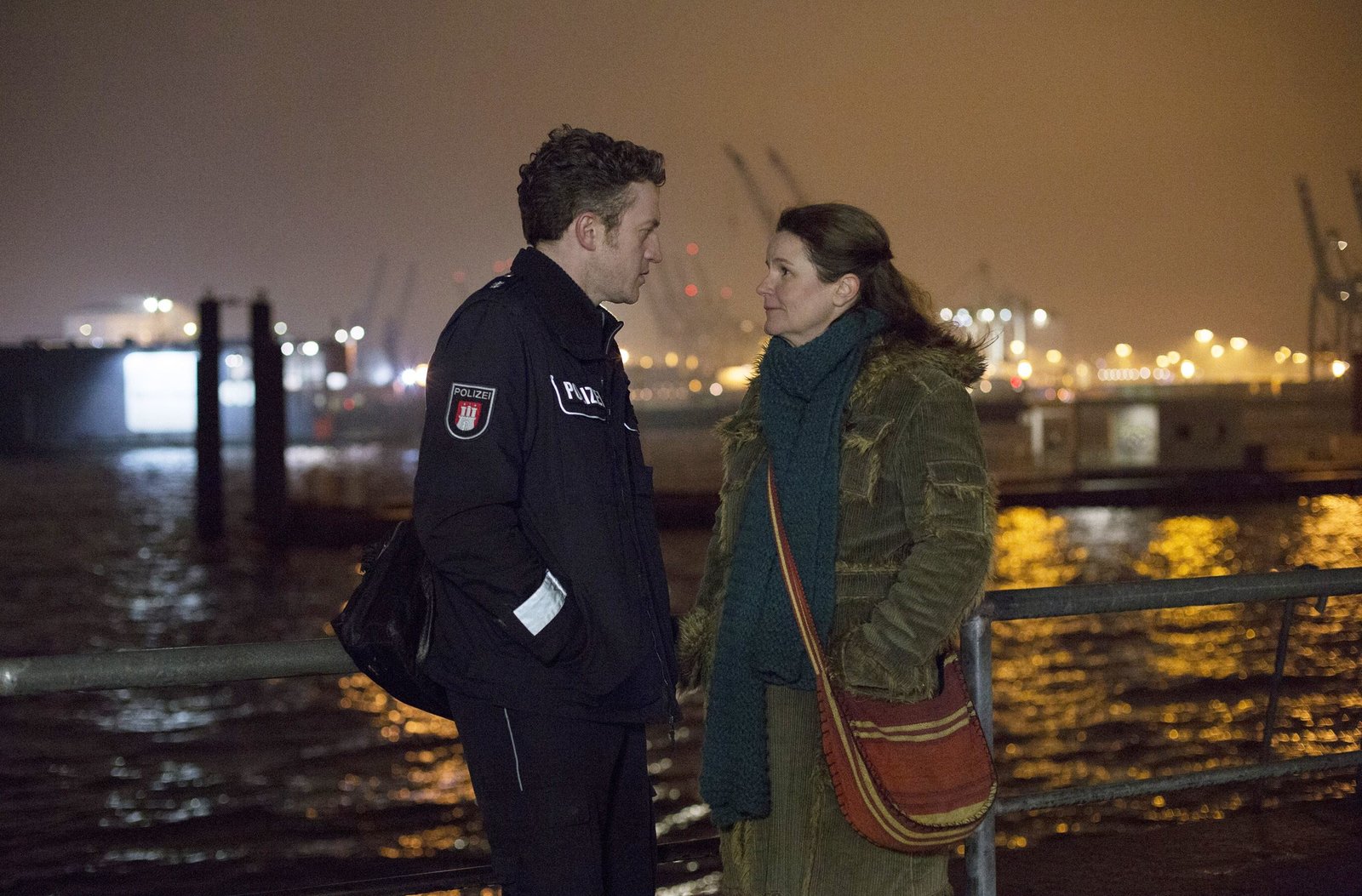 Ein schwerer VerdachtVor der nächtlichen Kulisse des Hamburger Hafen fragt Gudrun (Katrin Pollitt, r.) ihren Mann Gerd Wohlers (Josef Heynert, l.), ob er etwas über die Schwierigkeiten von Kommissar Hansen weiß.Bild: © ARD/Georges Pauly
