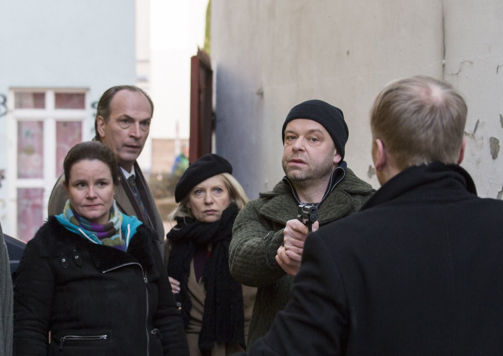 Üble TricksHansen (Robert Gallinowski, 2.v.r.) hält Barbesitzer Mirko Busse (Oli Bigalke, r.) in Schach. Gudrun (Katrin Pollitt, l.), Gellert (Herbert Knaup, 2.v.l.) und Isa (Sabine Postel, M.) kommen dazu.Bild: © ARD/Georges Pauly