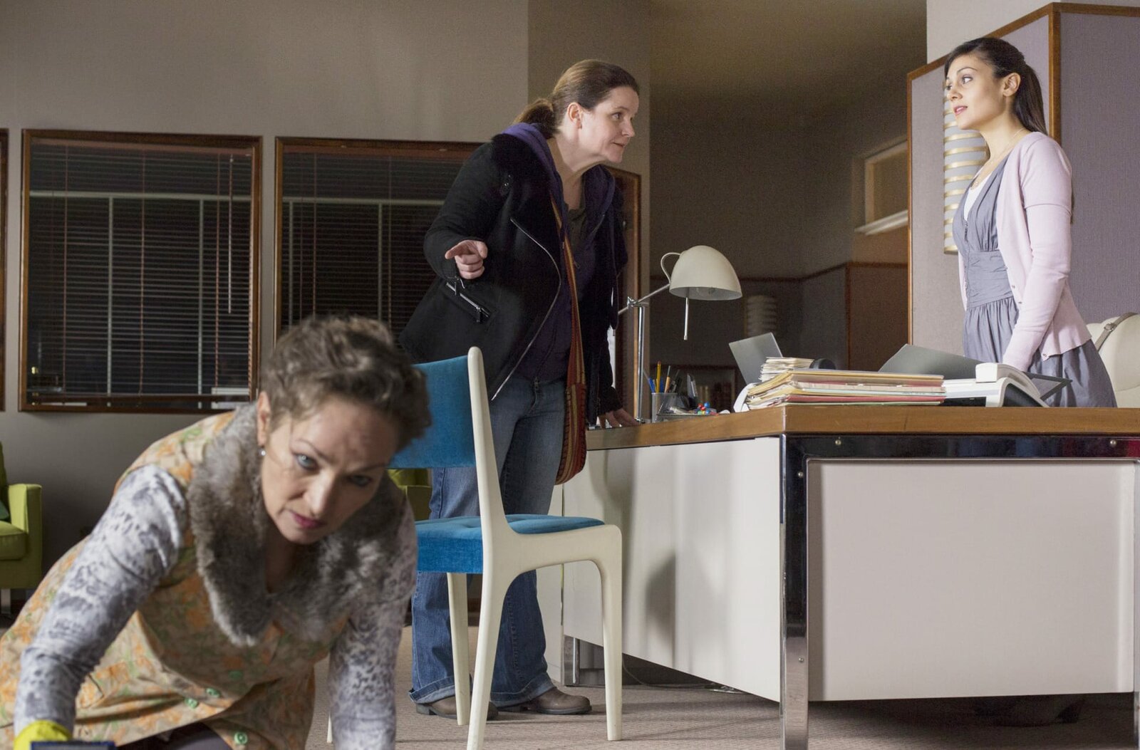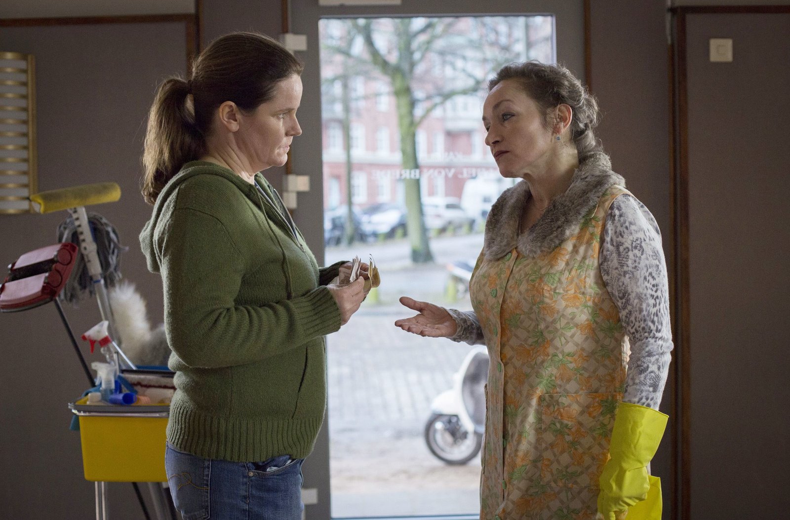 Stolz und VorurteilUrsula (Angelika Bartsch, l.) kann es Reinigungsfachkraft Gudrun (Katrin Pollitt, M.) nicht recht machen. Yasmin (Sophie Dal, r.) hält sich raus.Bild: © ARD/Georges Pauly