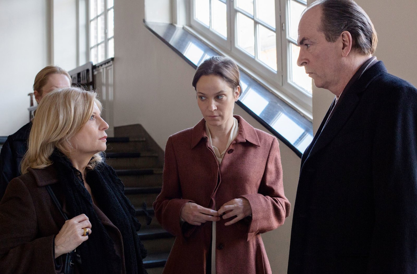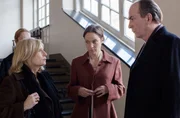 Kleine FluchtenIsa von Brede (Sabine Postel, l.) begleitet Anwalt Markus Gellert (Herbert Knaup, r.) und seine Mandantin Nora Becker (Jeanette Hain, M.) ins Gericht.Bild: © ARD/Georges Pauly