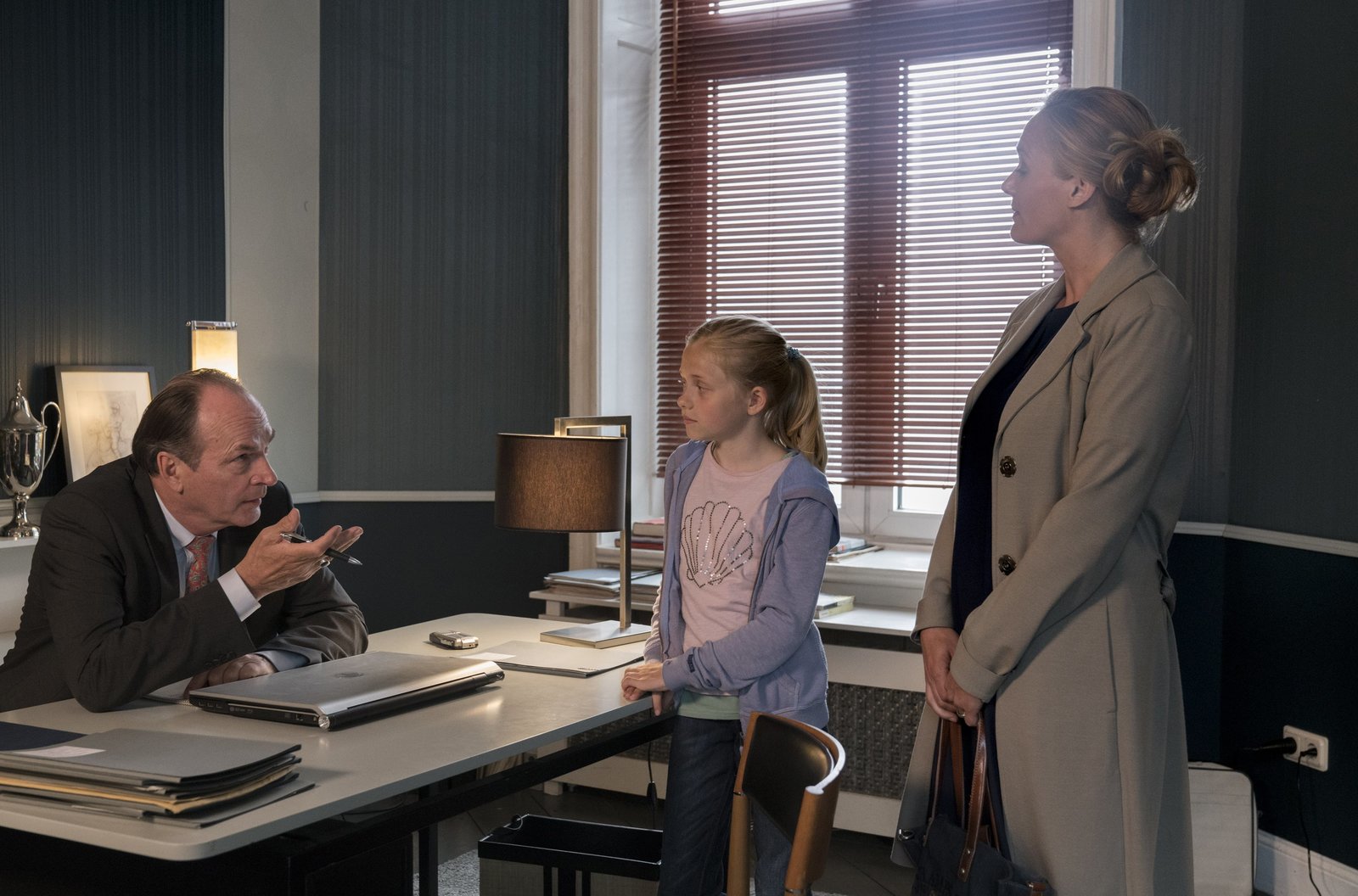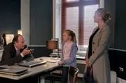 KinderkramGudruns Pflegekind Tina (Cya Emma Blaack, M.) sorgt für Wirbel in der Kanzlei. Das zehn Jahre alte Mädchen platzt in ein Gespräch zwischen Markus Gellert (Herbert Knaup, l.) und seiner Ex-Frau Maja (Sonsee Neu, r.).Bild: © ARD/Georges Pauly