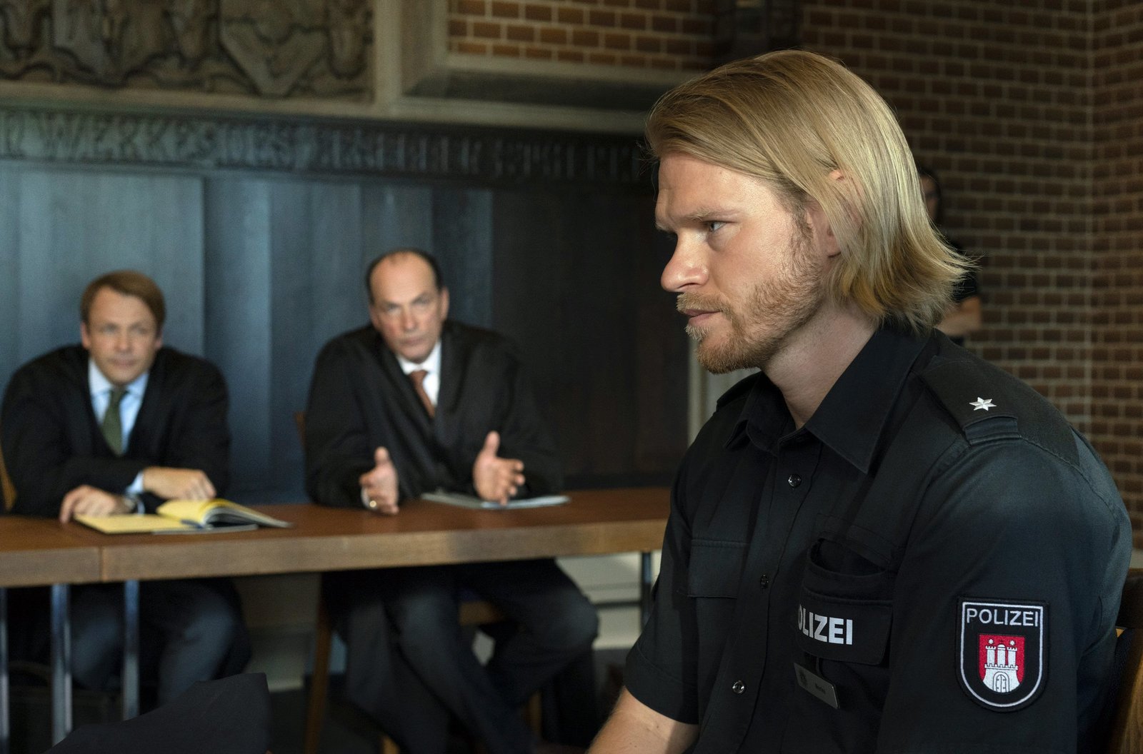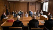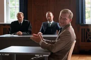 ExzessLars Meckel (Matthias Ziesing, l.) und Markus Gellert (Herbert Knaup, M.) warten gespannt auf die Aussage von Polizist Burghard Menke (Lennart Lemster, r.) vor Gericht.Bild: © ARD/Georges Pauly