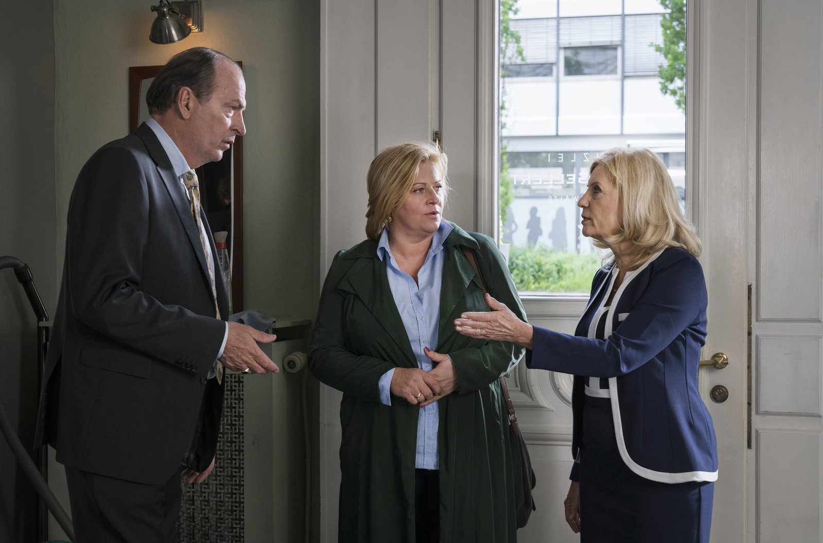AbsturzMarkus Gellert (Herbert Knaup, l.) und Isa von Brede (Sabine Postel, r.) diskutieren mit der Mandantin Martina Gunderson (Petra Kleinert, M.).Bild: © ARD/Georges Pauly