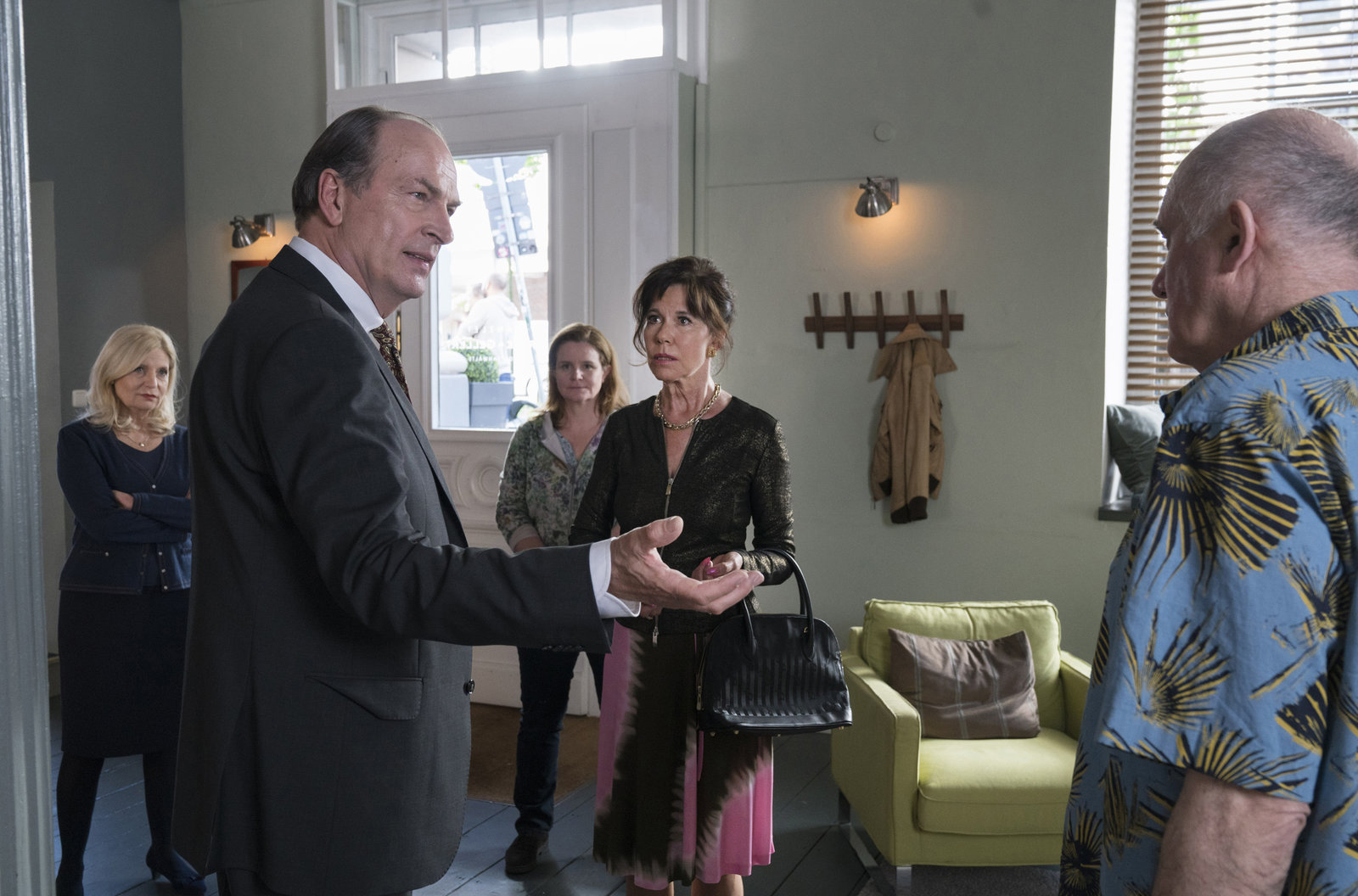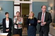 Falsche FreundeEin Fall fürs Pflegeheim? Markus Gellert (Herbert Knaup l.) konfrontiert Lydia Zumholt (Marion Martienzen, 2.v.r.) mit ihrem angeblich pflegebedürftigen Lebensgefährten Hubertus Dehling (Hans Zischler, r.). Als Zeugen Isa von Brede (Sabine Postel, Im HG l.) und Gudrun (Katrin Pollitt, im HG M.).Bild: © ARD/Georges Pauly