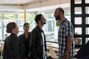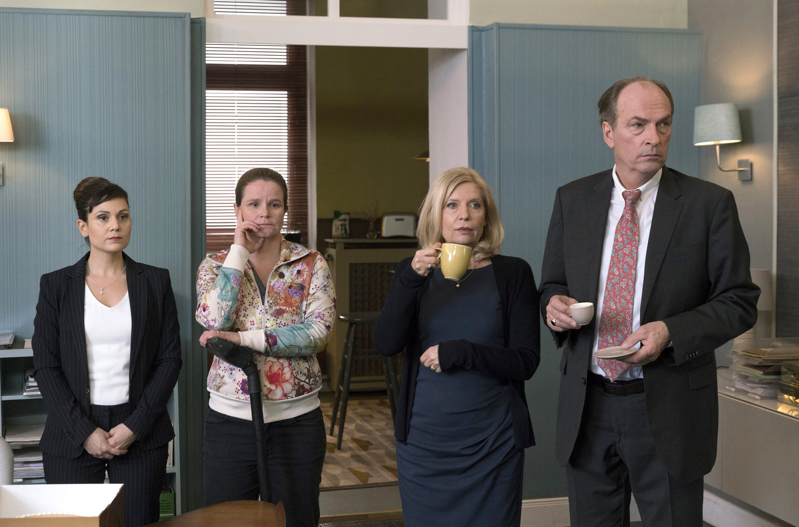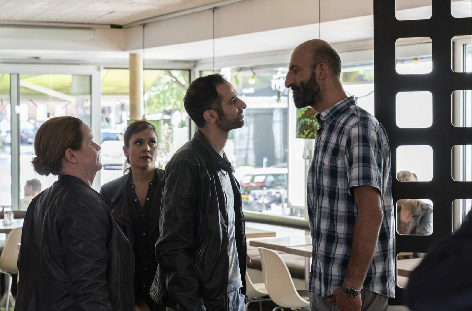 SchattenspieleARD DIE KANZLEI, III. Staffel, (11 neue Folgen), Folge 37 "Schattenspiele", am Dienstag (15.01.19) um 20.15 Uhr im Ersten. Gudrun Wohlers (Katrin Pollitt, l.) und Yasmin Meckel (Sophie Dal, 2.v.l.) beobachten den Streit zwischen Ergün Atasoy (Hadi Khanjanpour, 2.v.r.) und Galip Ülküm (Badasar Calbiyik, r.). © ARD/Georges Pauly - honorarfrei, Verwendung gemäss der AGB im engen inhaltlichen, redaktionellen Zusammenhang mit genannter ARD-Sendung bei Nennung: "Bild: ARD/Georges Pauly" (S2). ARD Programmdirektion/Bildredaktion, Tel. 089 5900 23879, mail: bildredaktion@daserste.deBild: © ARD/Georges Pauly