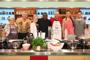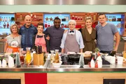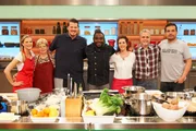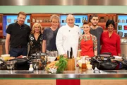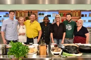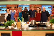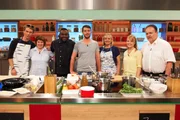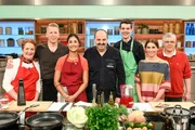 Nelson Müller sucht den SpitzenkochPascal Marcy (l.), Renate Zimmermann (2.v.l.), Nelson Müller (3.v.l.), Dominique Delhees (M.), Jutta Hemmersbach (3.v.r.), Romy Schneider (2.v.r.) und Jürgen Wildbrett (r.).Bild: © ZDF und Gunnar Nicolaus