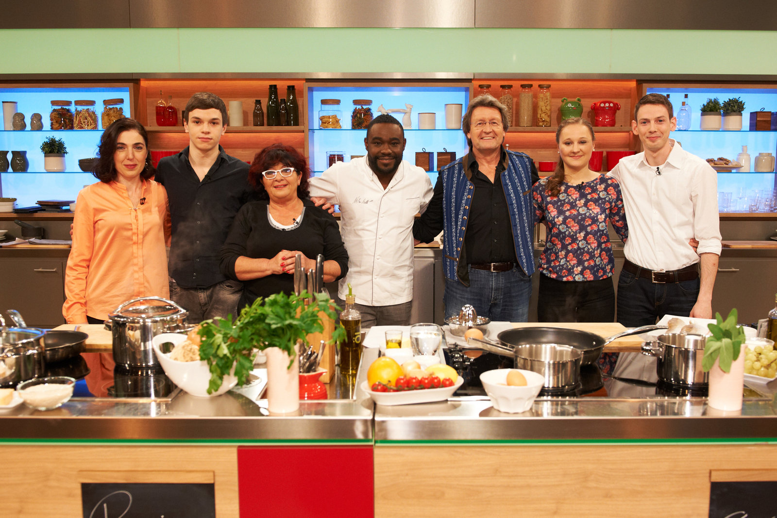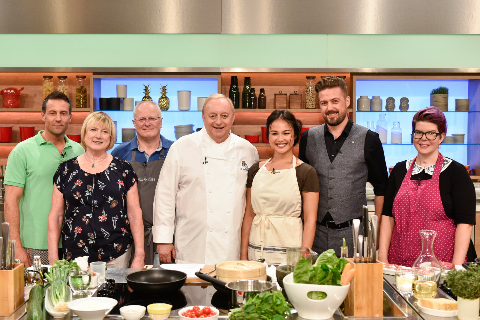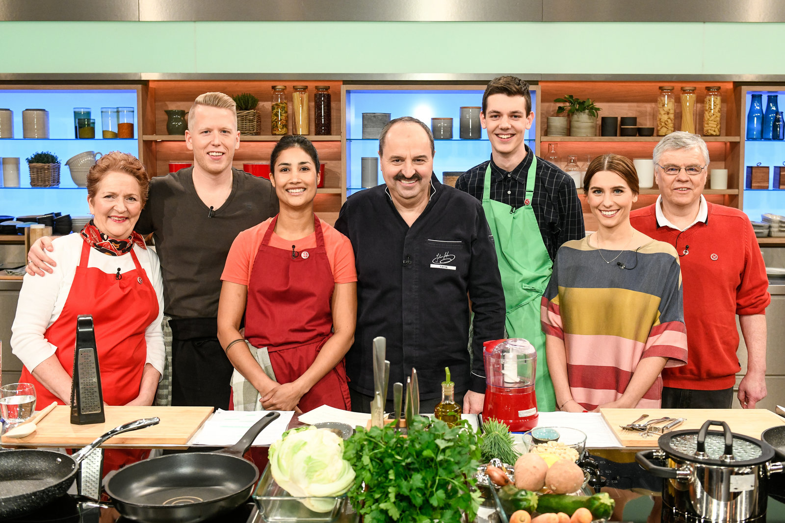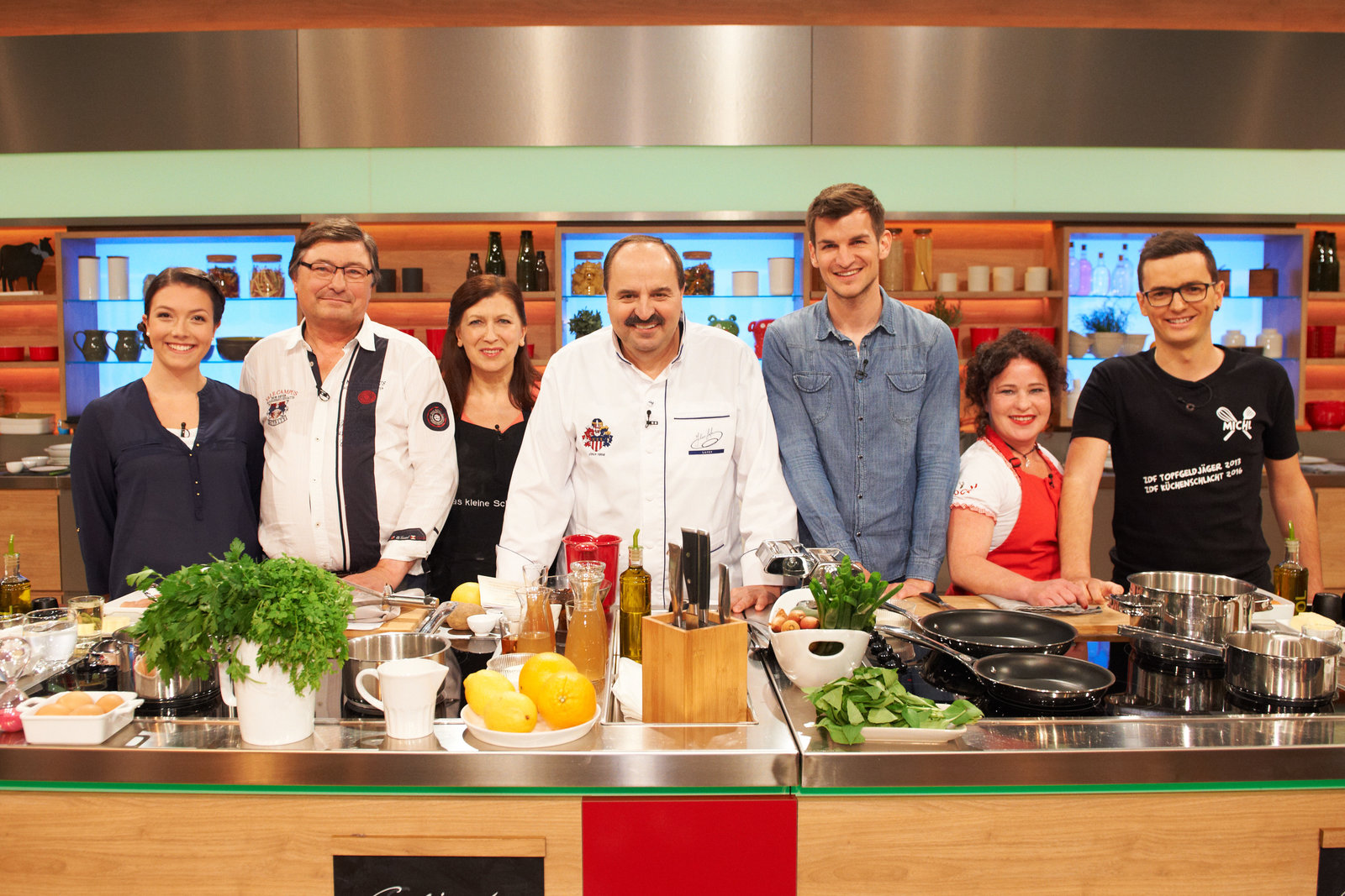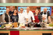 Alfons Schuhbeck sucht den SpitzenkochGisela Nießlbeck, Harry Grötz, Annette Lang, Nelson Müller, Hans-Ludwig Klein, Julia Fassbender und Nicholas Fanselow.Bild: © ZDF und Gunnar Nicolaus