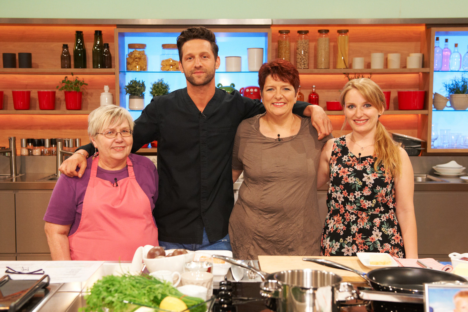 Alexander Kumptner sucht den SpitzenkochBarbara Randolph (l.), Alexander Kumptner (2.v.l.), Elke Welter (2.v.r.) und Pia Weber (r.).Bild: © ZDF und Gunnar Nicolaus