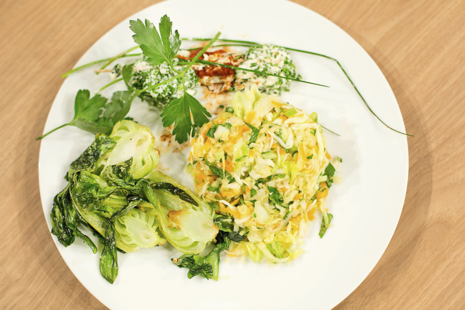 Nelson Müller sucht den SpitzenkochVorspeise: Gebratener Pak Choi mit Liptauer-Käsespießchen und Surówka von Julia OganowskiBild: © ZDF und Norman Kalle