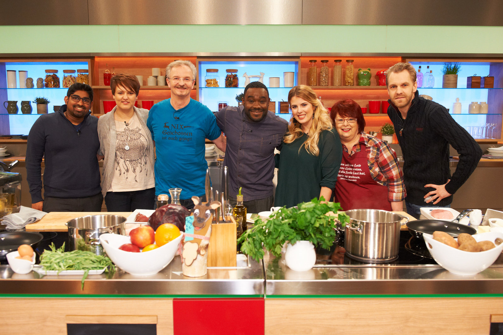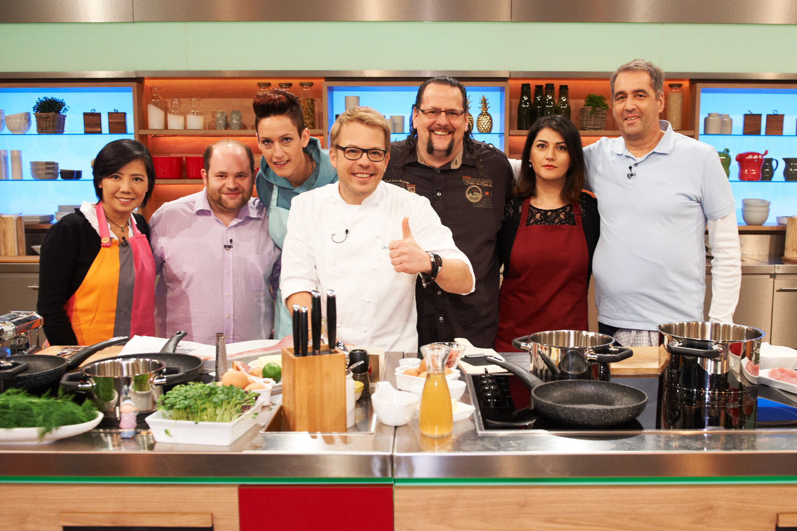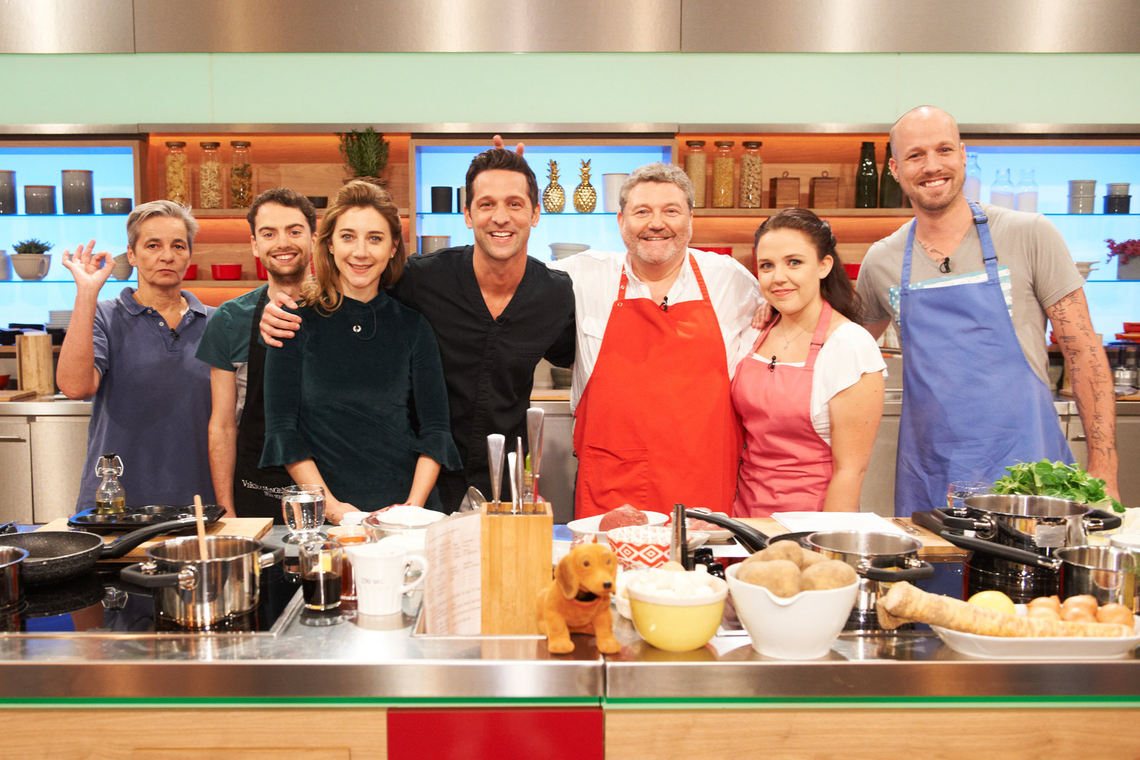 Mario Kotaska sucht den SpitzenkochBjörn Wendt, Sandra Zimmer, Philipp Hartmeyer, Mario Kotaska, Janka Alwon, Silva Gonzalez und Renate Zierler.Bild: © ZDF und Gunnar Nicolaus.