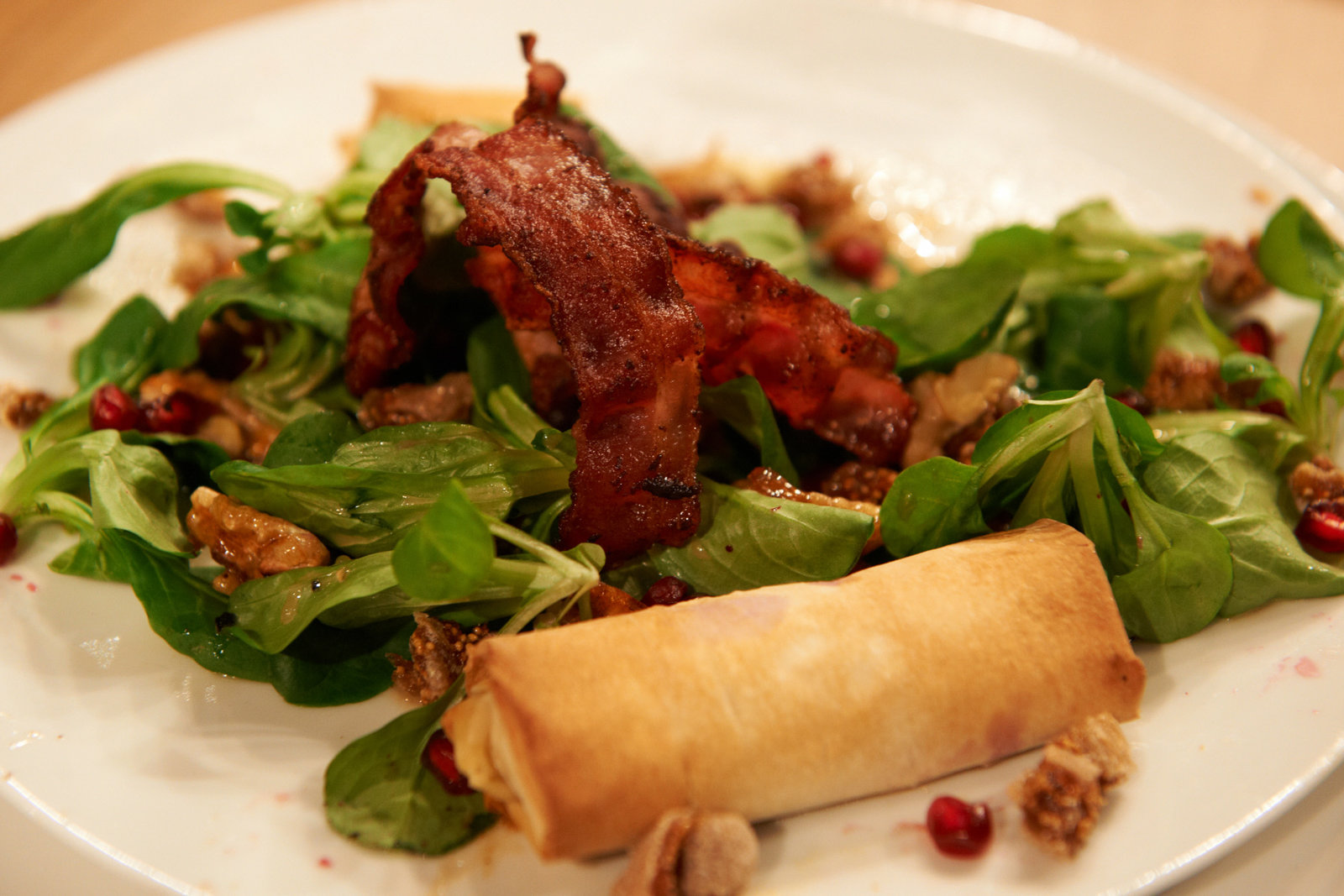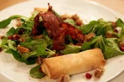Nelson Müller sucht den SpitzenkochFruchtiger Feldsalat mit Speck, Feigen, karamellisierten Walnüssen und Tomaten-Filoröllchen Vorspeise von Günter KurzBild: © ZDF und Gunnar Nicolaus