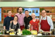 Johann Lafer sucht den SpitzenkochJulia Compans (l.), Detlev Hillmann (2.v.l.), Gerlinde Kreuzeder (3.v.l.), Johann Lafer (M.), Christian Hölker (3.v.r.), Francesca Scarano (2.v.r.) und Michael Tasser (r.).Bild: © ZDF und Gunnar Nicolaus