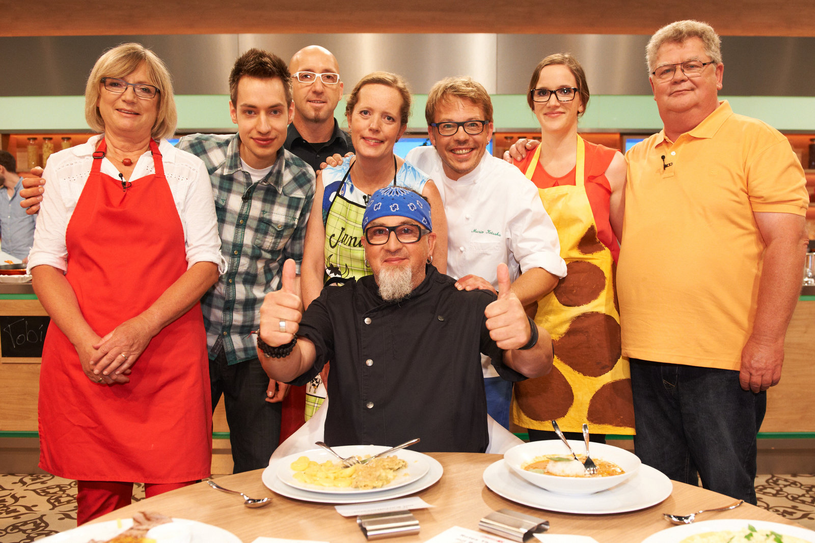 Mario Kotaska sucht den SpitzenkochMirko Roberto Andersen, Jeannine Langer, Bernhard Hereth, Mario Kotaska, Karin Opitz-Kreher, Christian Becker und Karin Hämmerle.Bild: © ZDF und Markus Hertrich.