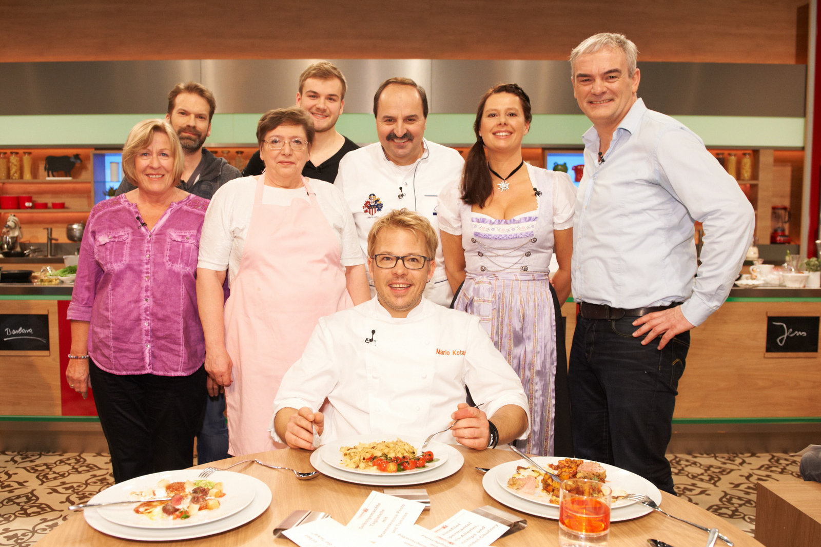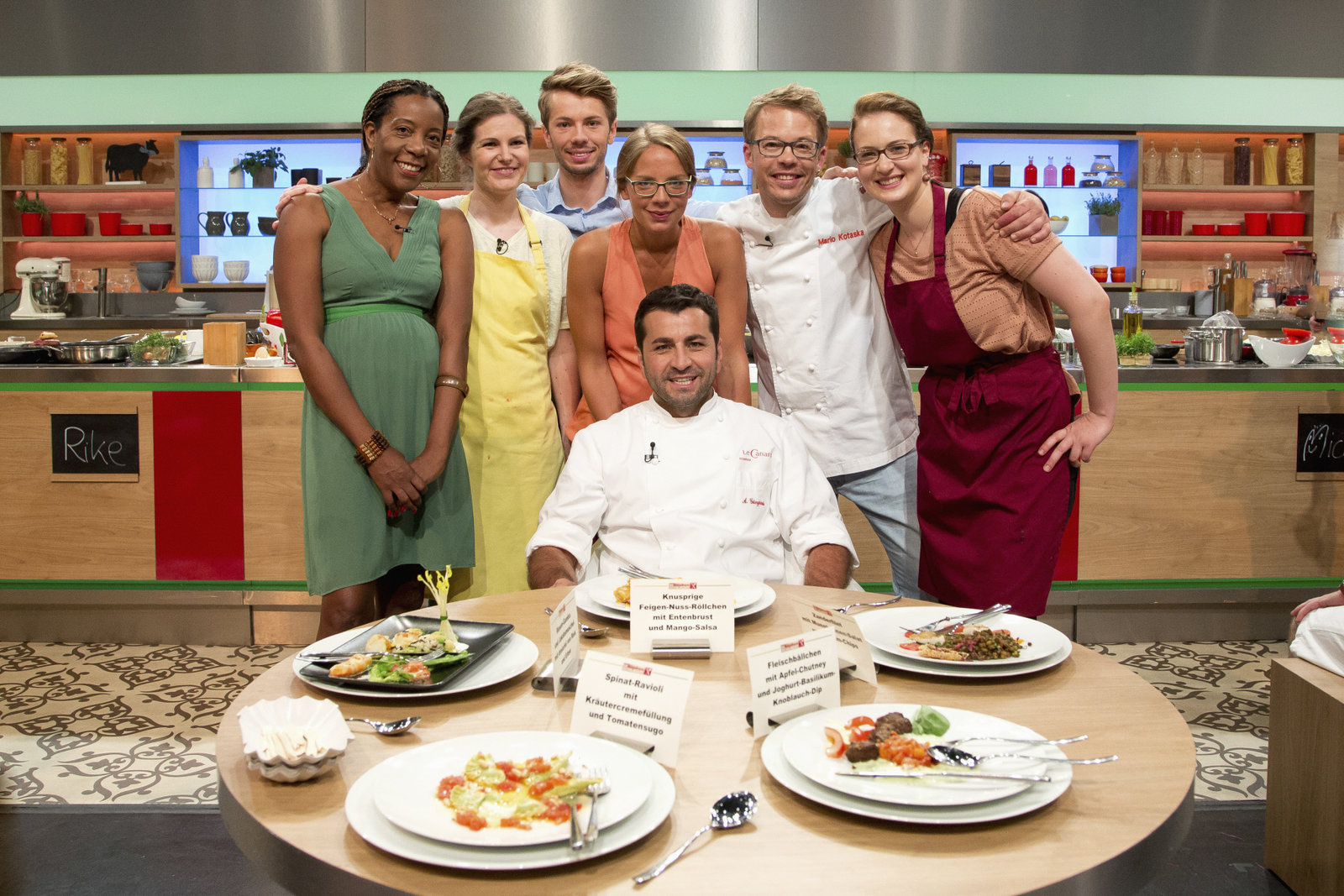 Mario Kotaska sucht den SpitzenkochVerena Leister, Angelika Jakulat, Christian Elsner, Andreas C. Studer, Mario Kotaska, Michèle van Beirs, Michael ReichBild: © ZDF und Gunnar Nicolaus