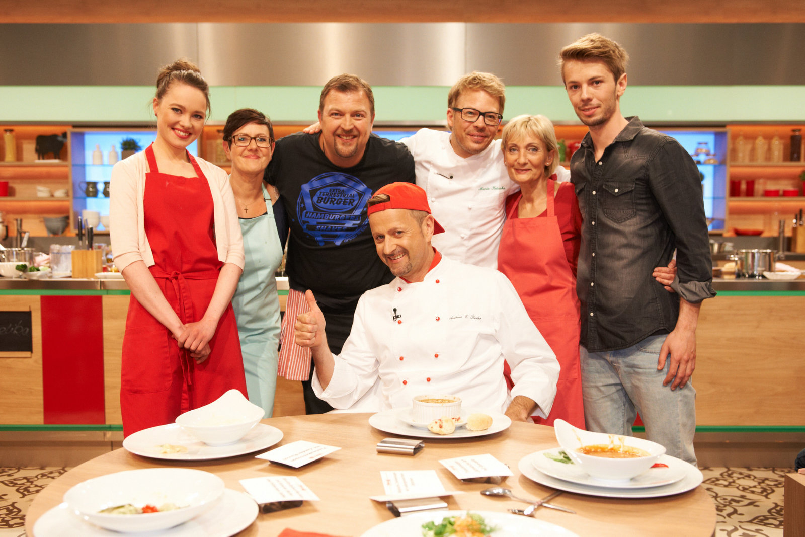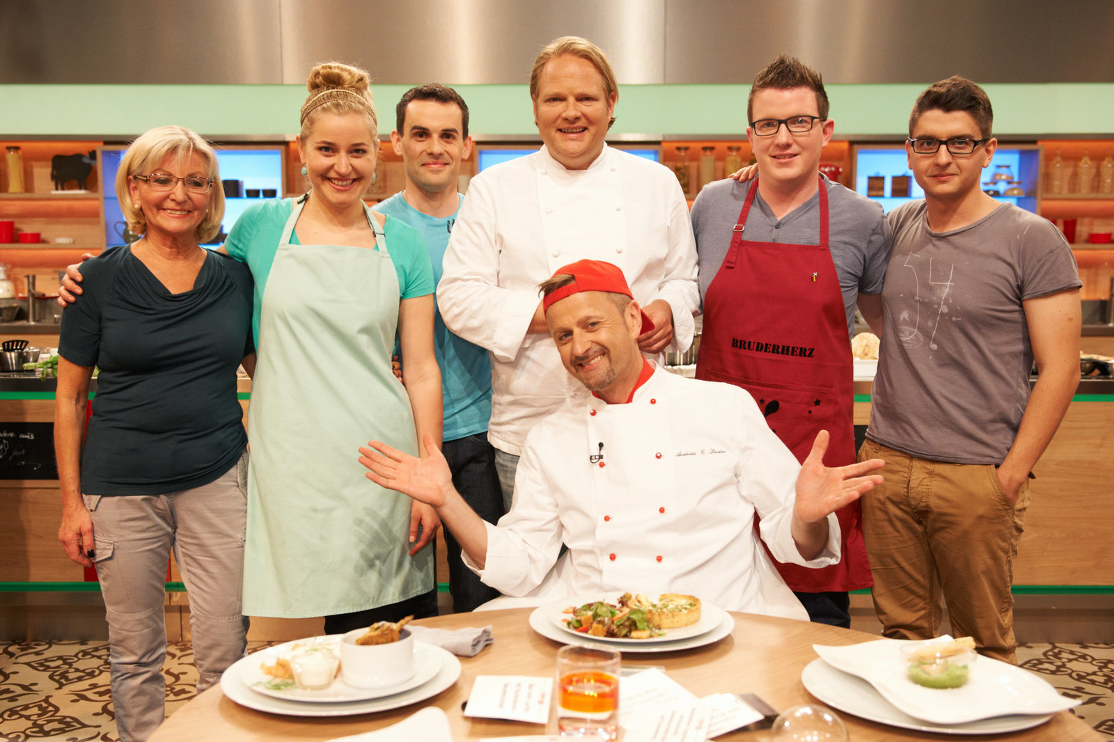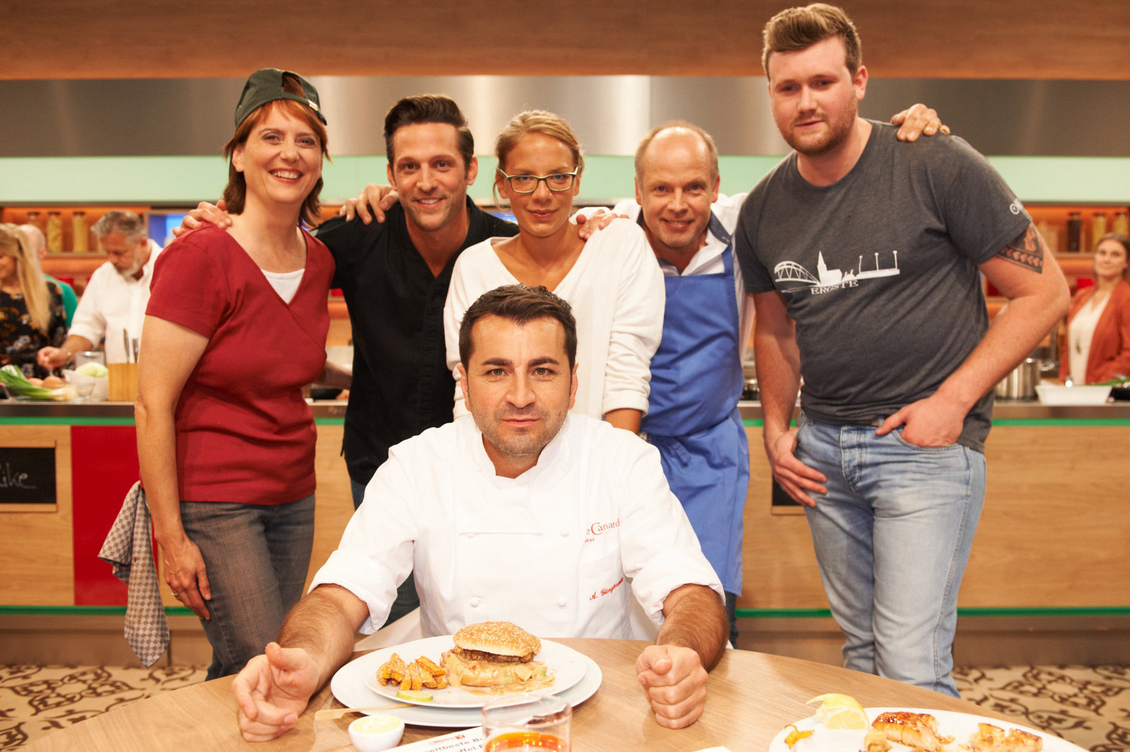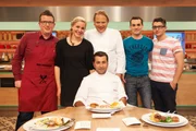 Alexander Herrmann sucht den SpitzenkochNihal Yegin, Mattia Giannone, Stefanie Gaismayer, Alexander Herrmann, Elisabeth Noelle, Oliver Löhr und Stefan Pries.Bild: © ZDF und Gunnar Nicolaus