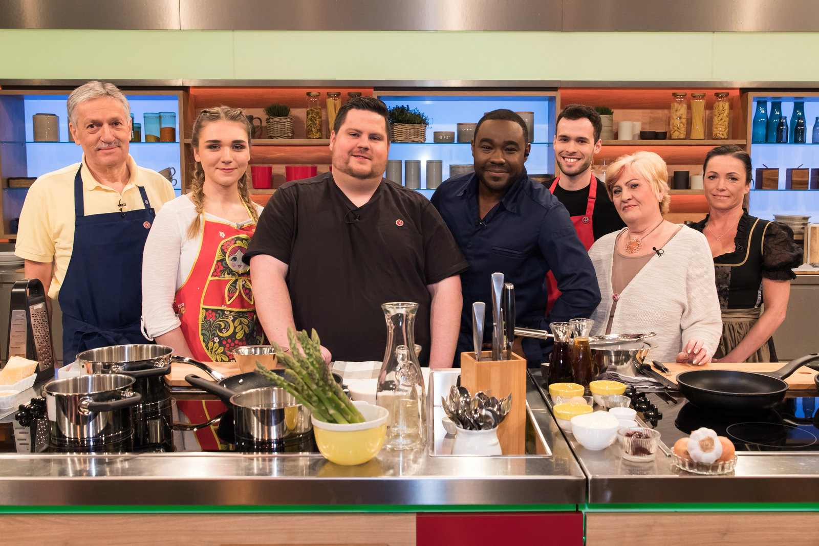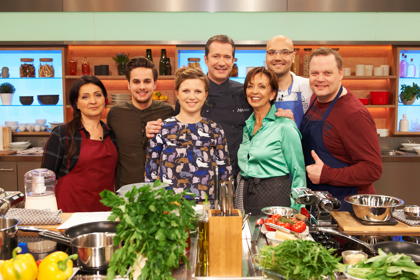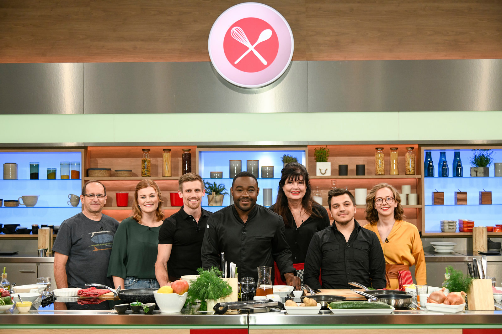 Alexander Herrmann sucht den SpitzenkochNihal Yegin, Mattia Giannone, Stefanie Gaismayer, Alexander Herrmann, Elisabeth Noelle, Oliver Löhr und Stefan Pries.Bild: © ZDF und Gunnar Nicolaus