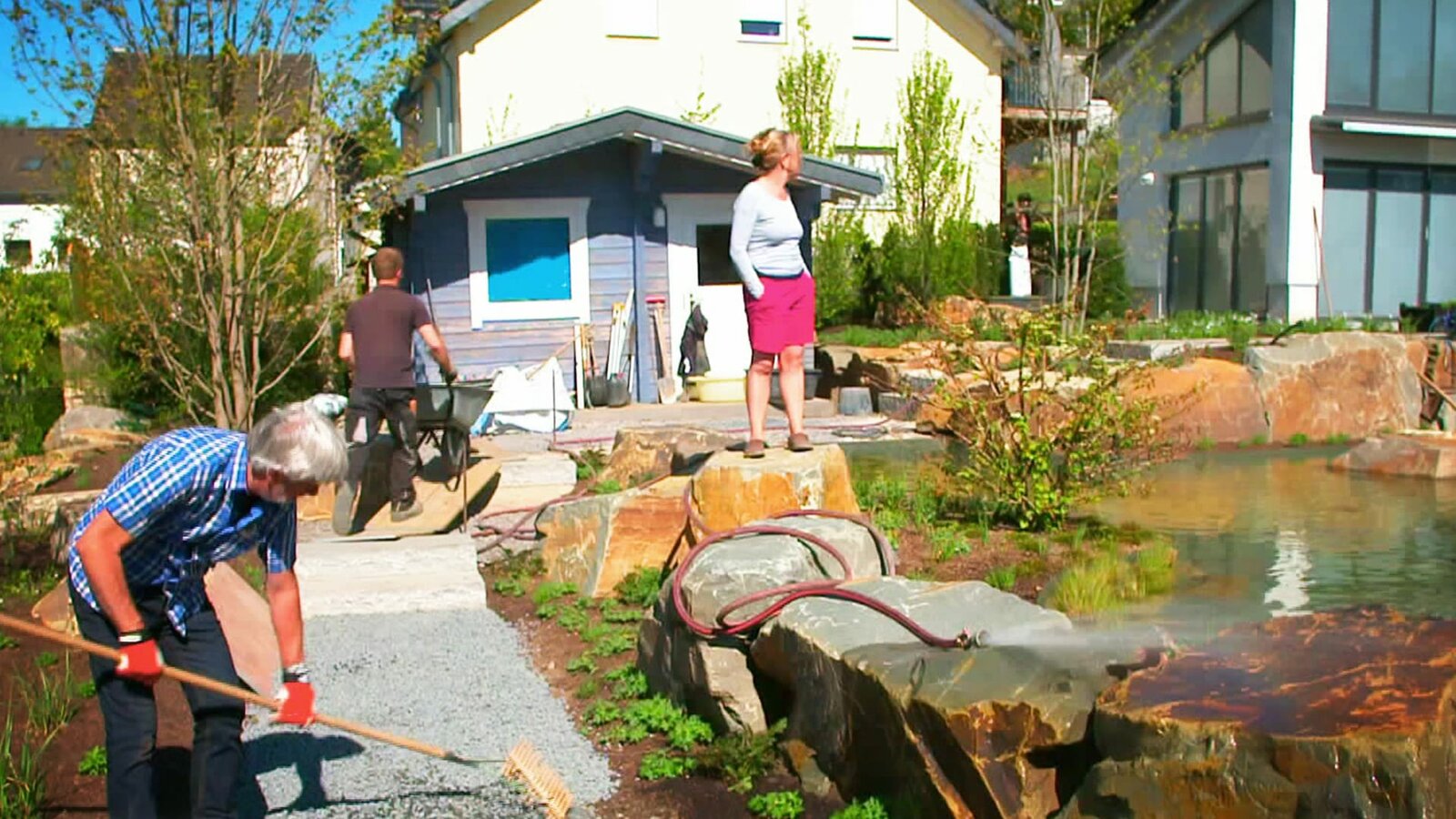 Traumgärten-Finale in Nordrhein-WestfalenFür Meistergärtner Peter Berg heißt es im Stolberger Garten: Pflanzzeit. Insgesamt müssen mehr als 2000 Stauden und Gräser in den Boden. Dazu kommen verschiedene Gehölze, die die Wasserlandschaft mit Blick auf die Burg Stolberg abrunden sollen. Ob das Gesamtbild den Bauherren am Ende zusagt? In Neuss sind die Arbeiten am neuen Traumgarten aus der Hand von André Eickhoff bereits in vollem Gange. Die leichte Hanglage des Grundstücks soll durch eine Terrassierung verschwinden. So entsteht eine große ebene Fläche zum Spielen für die Kinder. Mit der Bepflanzung wird aus der Baustelle ein richtiger Garten. Zeit für die Übergabe an die Bauherren!Bild: © HGTV