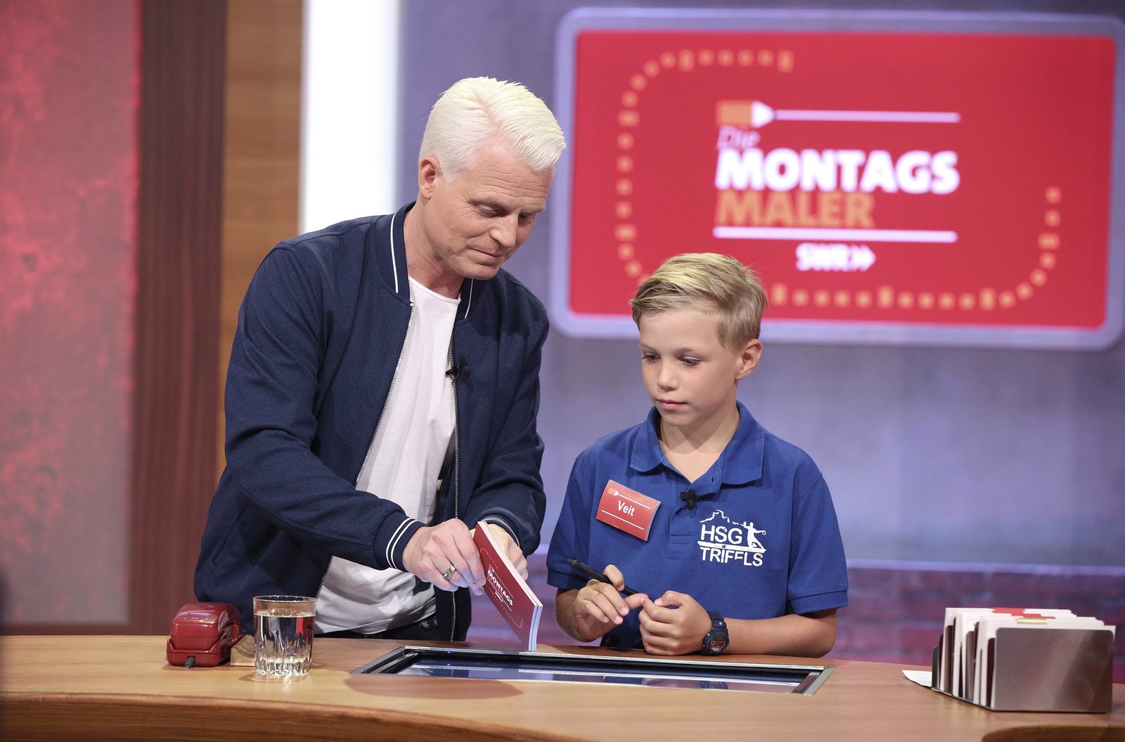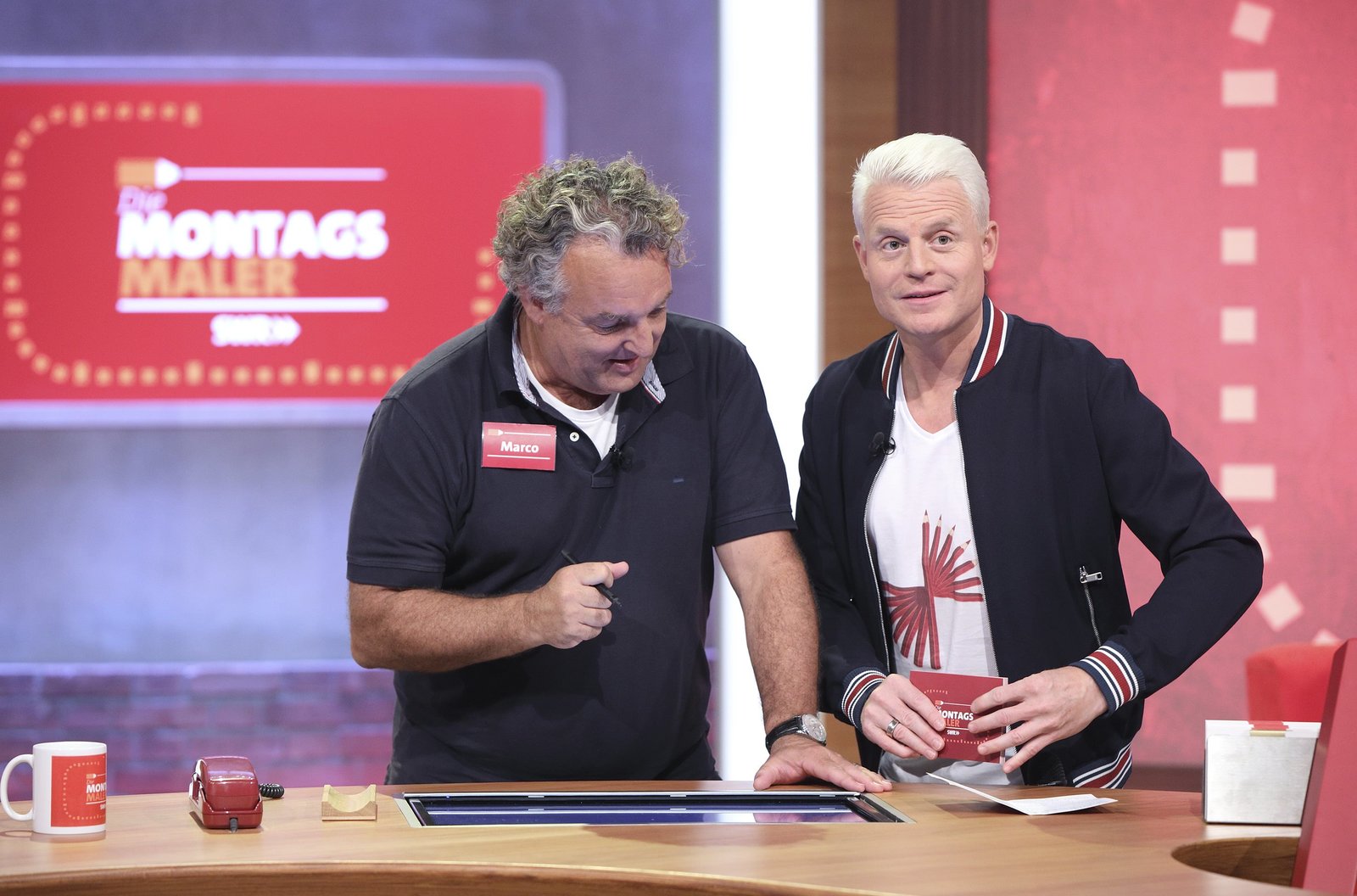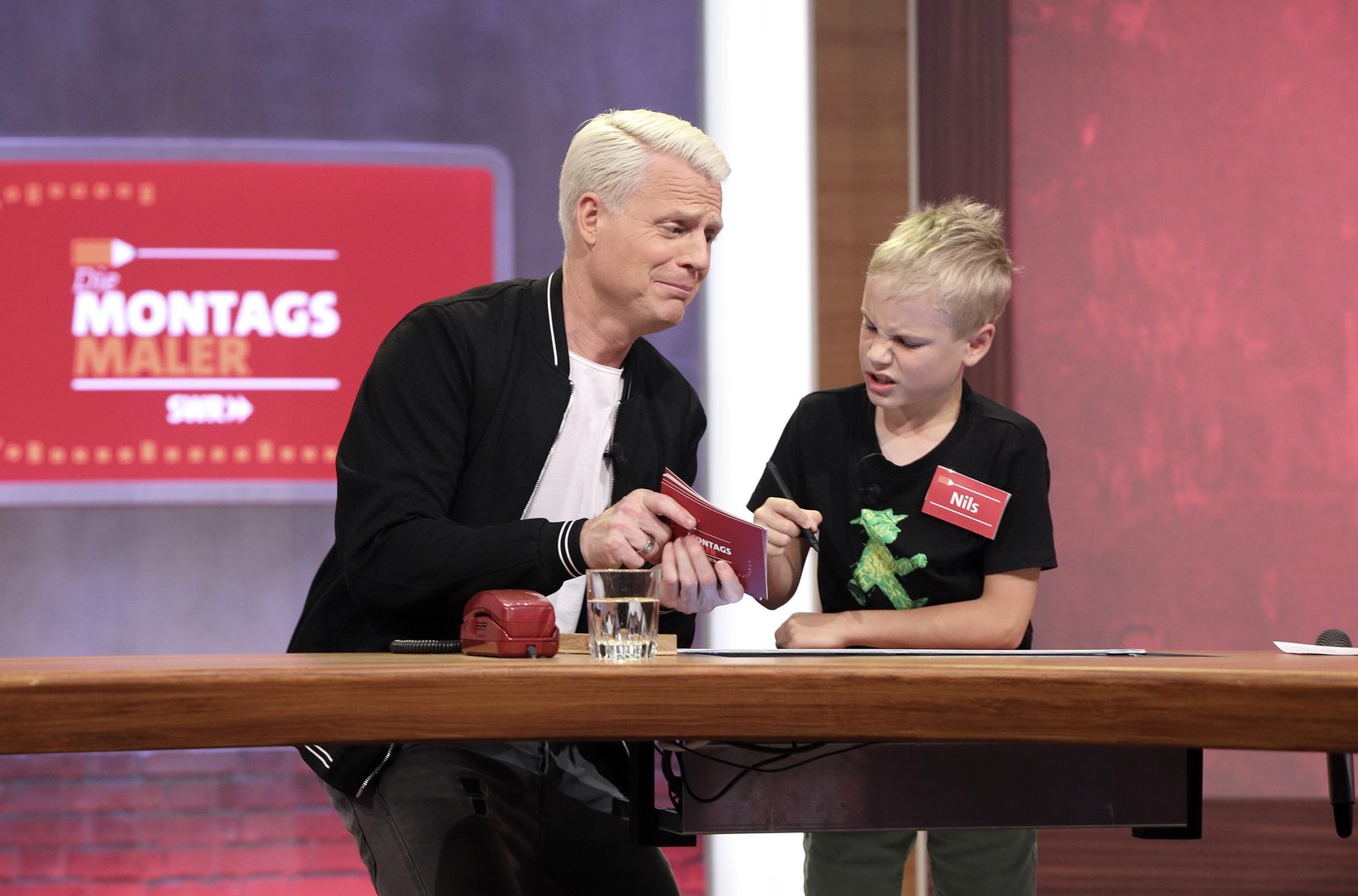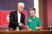 Reden & Singen - Bewegen & SpringenIn jeder Sendung tritt ein Team von vier Prominenten gegen acht Kandidaten aus dem Südwesten an – vier Kinder und vier Erwachsene. Und wieder dreht sich alles um die Frage: Wer malt und rät am besten? v.li.: Guido Cantz mit Nils Schnörringer.Bild: © SWR/Bavaria/Frank Hempel
