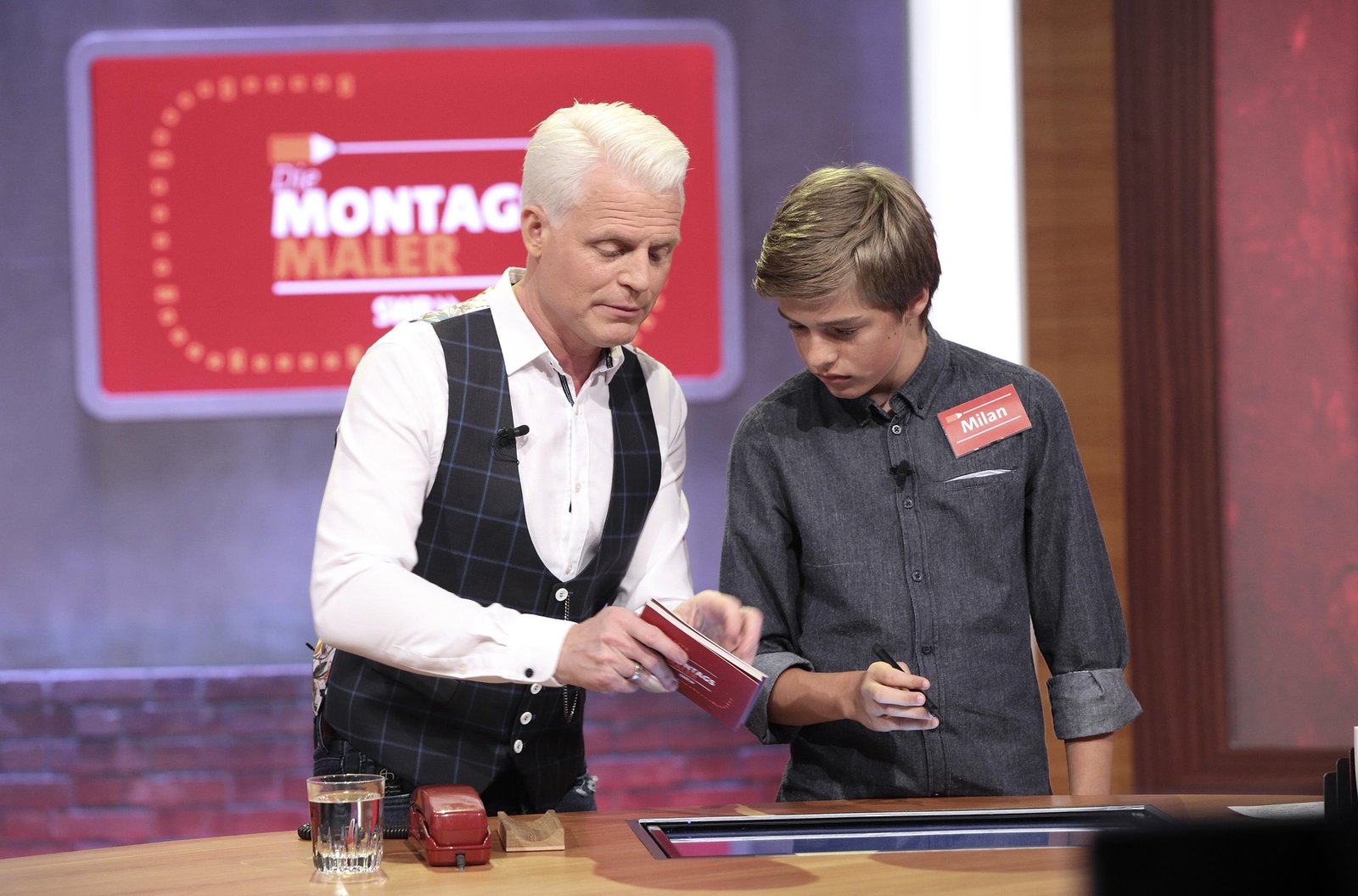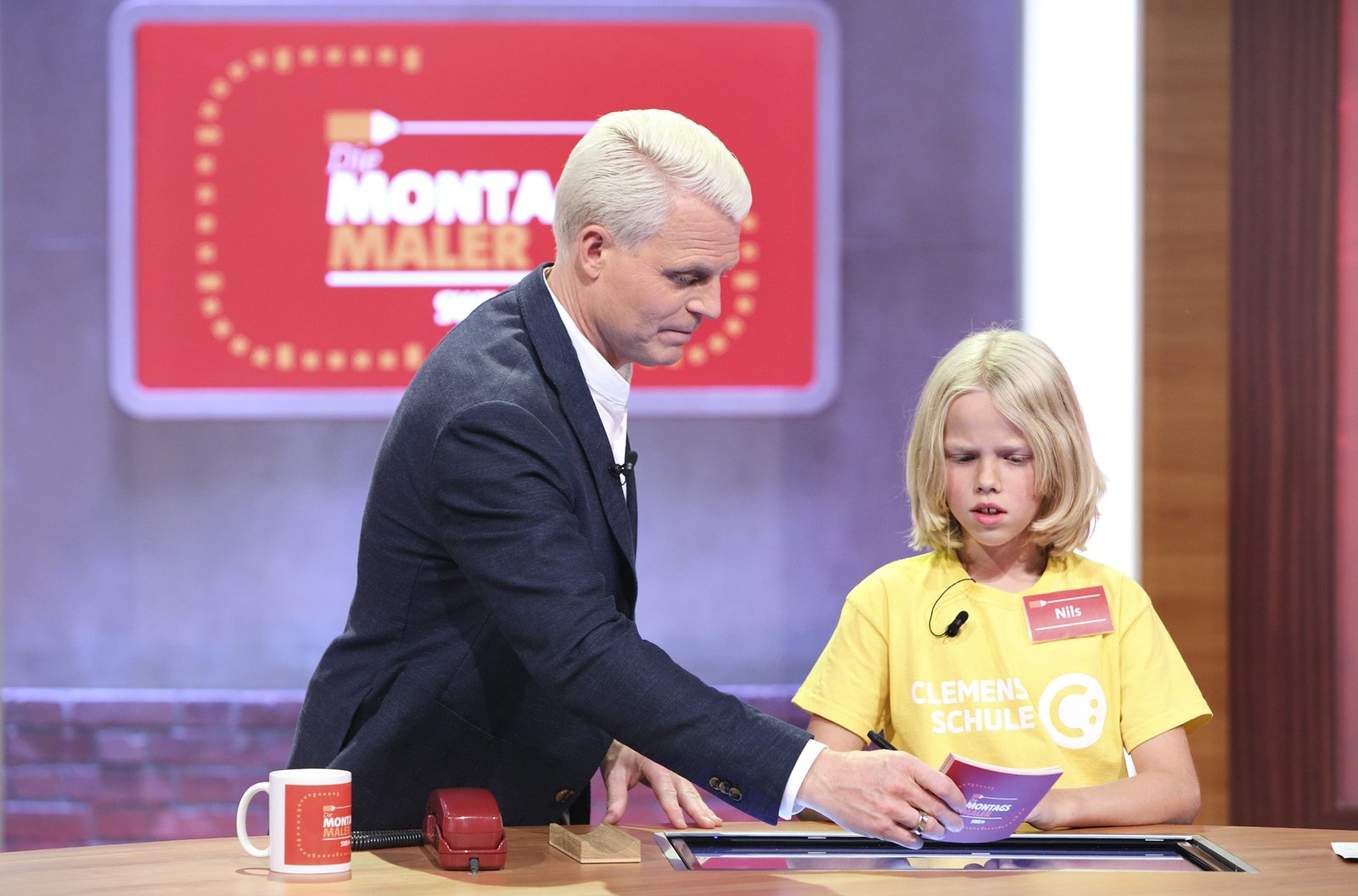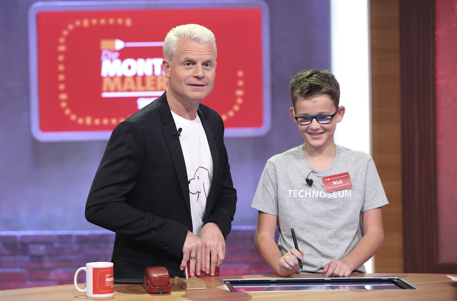 Reden & Singen - Bewegen & SpringenIn jeder Sendung tritt ein Team von vier Prominenten gegen acht Kandidaten aus dem Südwesten an – vier Kinder und vier Erwachsene. Und wieder dreht sich alles um die Frage: Wer malt und rät am besten? v.li.: Guido Cantz mit Nils Schnörringer.Bild: © SWR/Bavaria/Frank Hempel