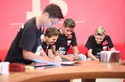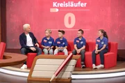 Lecker & Lustig - Lang & WendigIn jeder Sendung tritt ein Team von vier Prominenten gegen acht Kandidaten aus dem Südwesten an – vier Kinder und vier Erwachsene. Und wieder dreht sich alles um die Frage: Wer malt und rät am besten? v.li.: Guido Cantz und Mitglieder des TSV Ettlingen v.li. Milan Fömmel, Felicitas Frey, Flavia Lübben und Lea Siegeritz.Bild: © SWR/Bavaria/Frank Hempel
