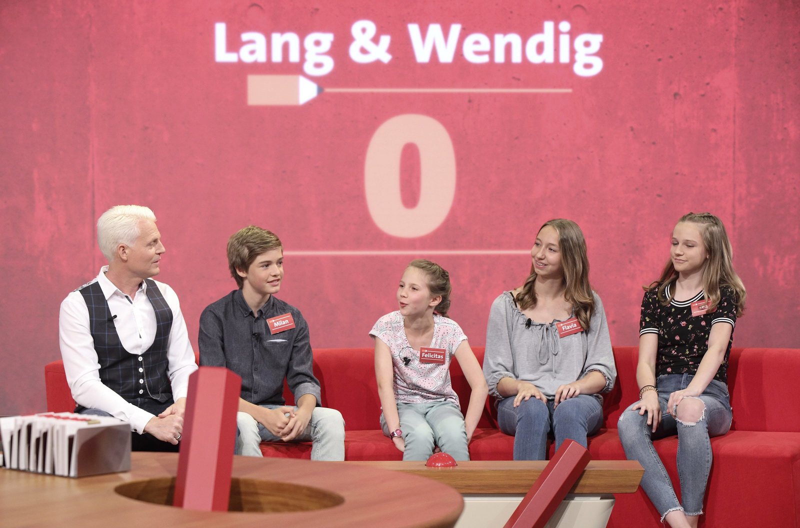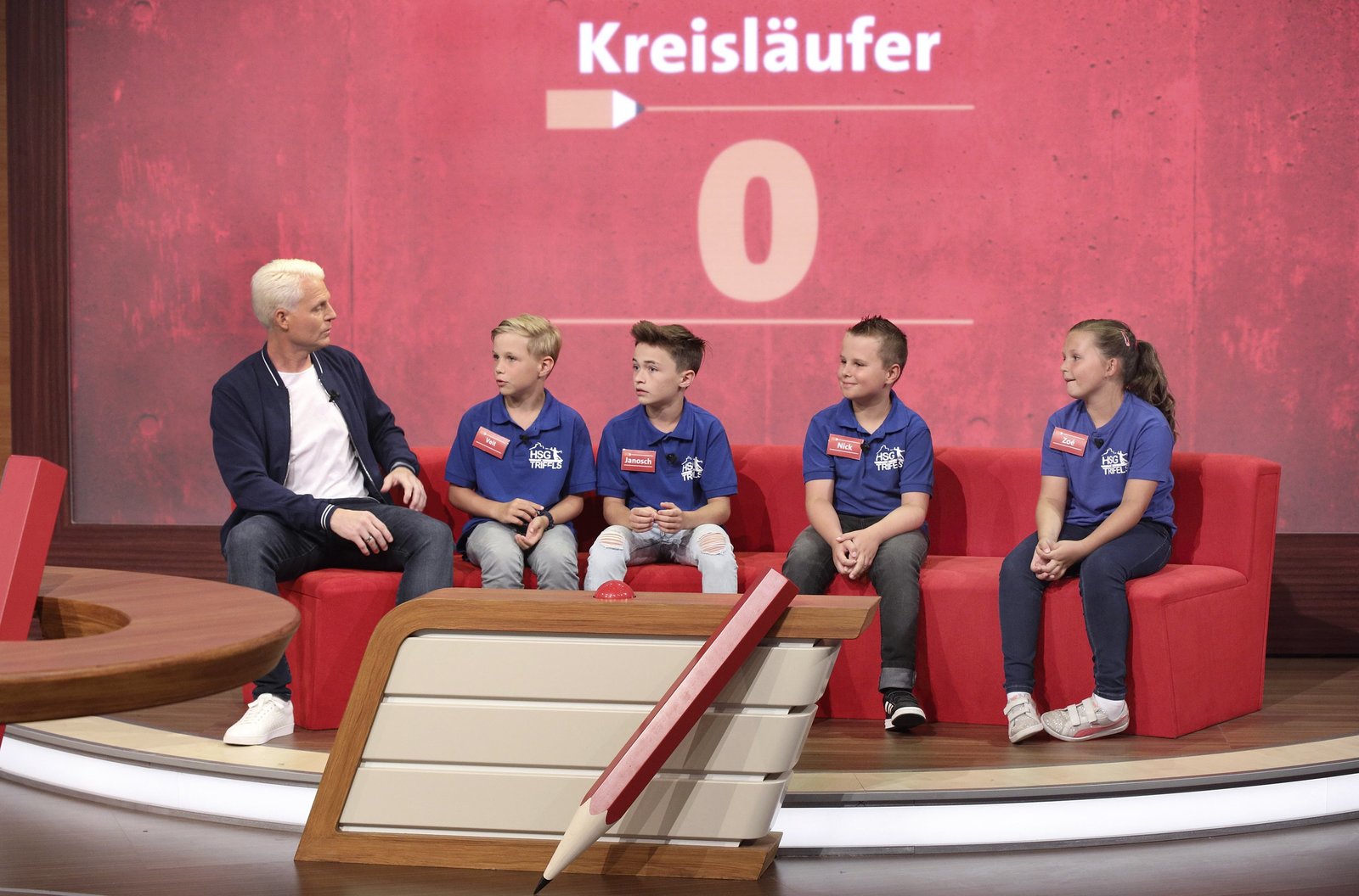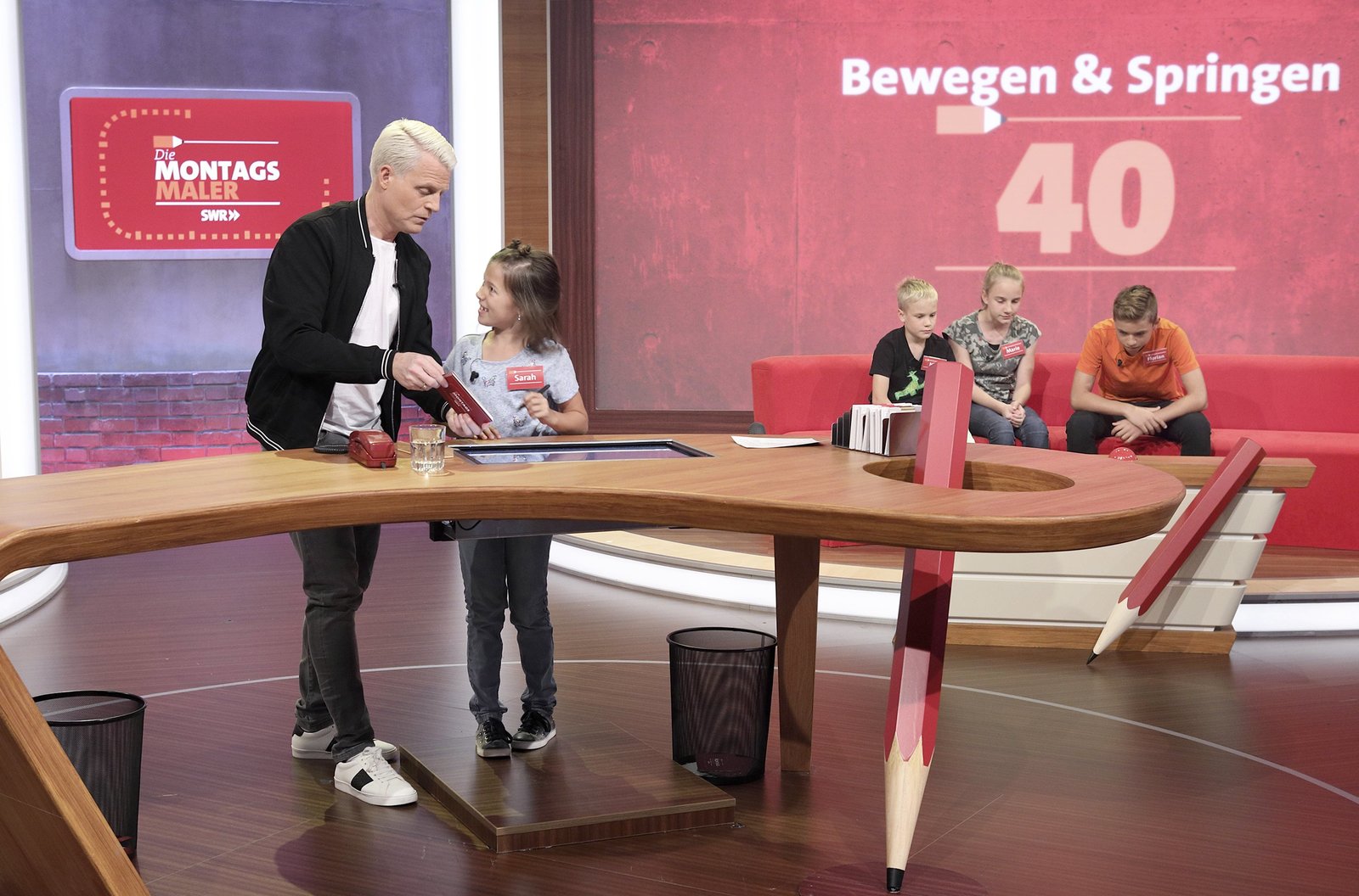 Reden & Singen - Bewegen & SpringenIn jeder Sendung tritt ein Team von vier Prominenten gegen acht Kandidaten aus dem Südwesten an – vier Kinder und vier Erwachsene. Und wieder dreht sich alles um die Frage: Wer malt und rät am besten? v.li.: Guido Cantz mit Sarah Hupfer, Nils Schnörringer, Marie Schnörringer, Florian Nehring.Bild: © SWR/Bavaria/Frank Hempel