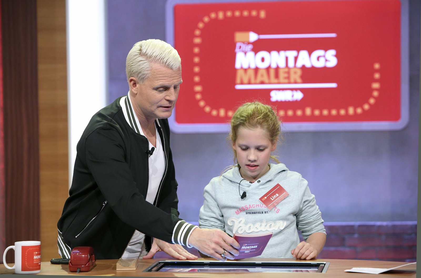 Herrenrunde - KlassenzimmerIn jeder Sendung tritt ein Team von vier Prominenten gegen acht Kandidaten aus dem Südwesten an – vier Kinder und vier Erwachsene. Und wieder dreht sich alles um die Frage: Wer malt und rät am besten? Guido Cantz im Spiel mit Fee Slomka.Bild: © SWR/Bavaria/Frank Hempel