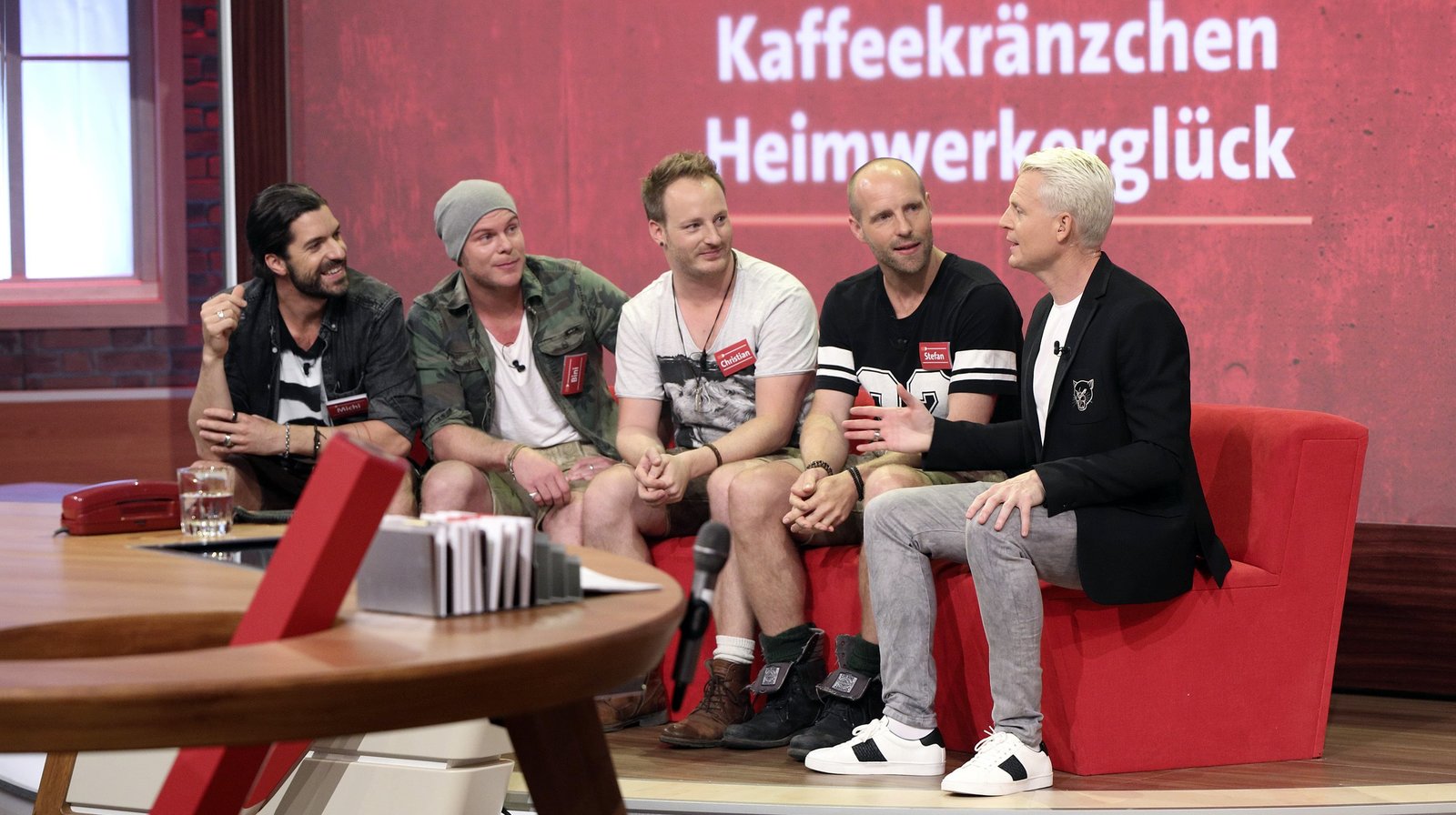 Stramme Waden - Flotte FlitzerIn jeder Sendung tritt ein Team von vier Prominenten gegen acht Kandidaten aus dem Südwesten an – vier Kinder und vier Erwachsene. Und wieder dreht sich alles um die Frage: Wer malt und rät am besten? v.li. "voXXclub" mit Michi, Bini, Christian, Stefan und Guido Cantz.Bild: © SWR/Bavaria/Frank Hempel