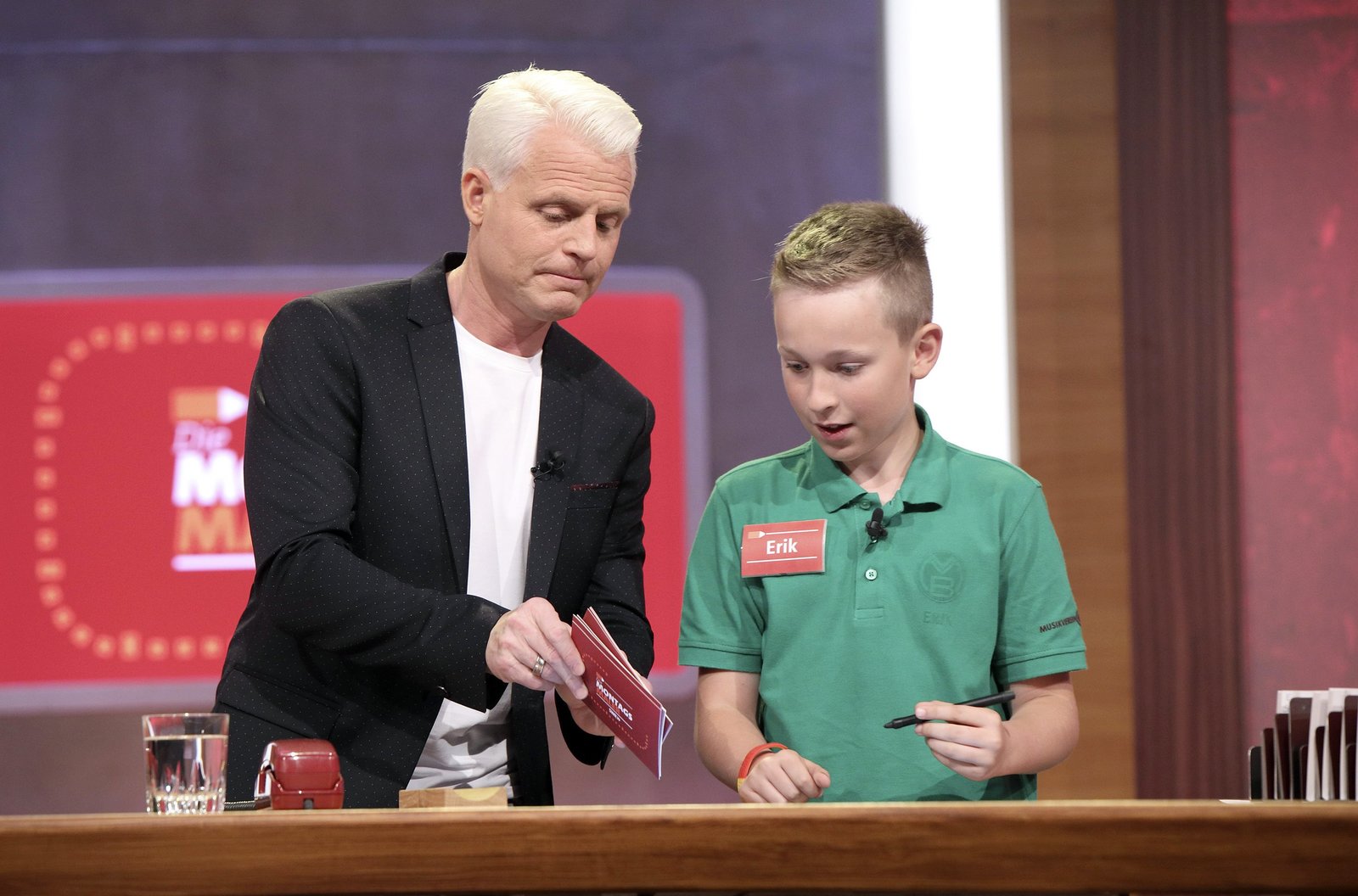 Und Bitte! - Im Takt!In jeder Sendung tritt ein Team von vier Prominenten gegen acht Kandidaten aus dem Südwesten an – vier Kinder und vier Erwachsene. Und wieder dreht sich alles um die Frage: Wer malt und rät am besten? Guido Cantz zeigt Erik (Musikverein Bettringen) den Begriff und los gehts.Bild: © SWR/Bavaria/Frank Hempel