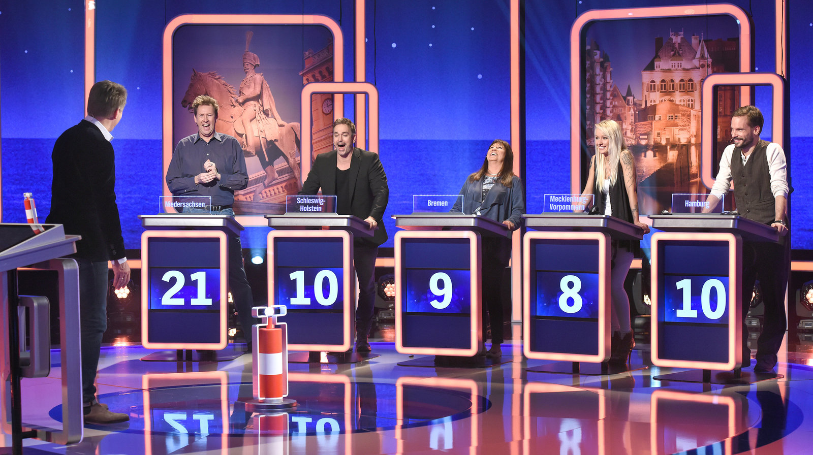 Moderator Jörg Pilawa mit den Kandidaten: Lou Richter (Niedersachsen, Moderator), Manou Lubowski (Schleswig-Holstein, Schauspieler), Uschi Nerke (Bremen, Moderatorin), Kristin Stark (Mecklenburg-Vorpommern, Sängerin), Wanja Mues (Hamburg, Schauspieler)Bild: © NDR/Uwe Ernst