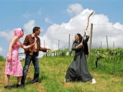 Eine Leiche in der KapelleUnerschrocken zückt Schwester Camilla (Ann-Kathrin Kramer) einen Ast, um für die bedrohte Schöne zu kämpfen! Doch das Paar (Deborah Kaufmann und Sebastian Rüger) versucht sie zu beruhigen: falscher Alarm, alles nicht so ernst gemeint!Bild: © SWR/Stefanie Kuhlbach