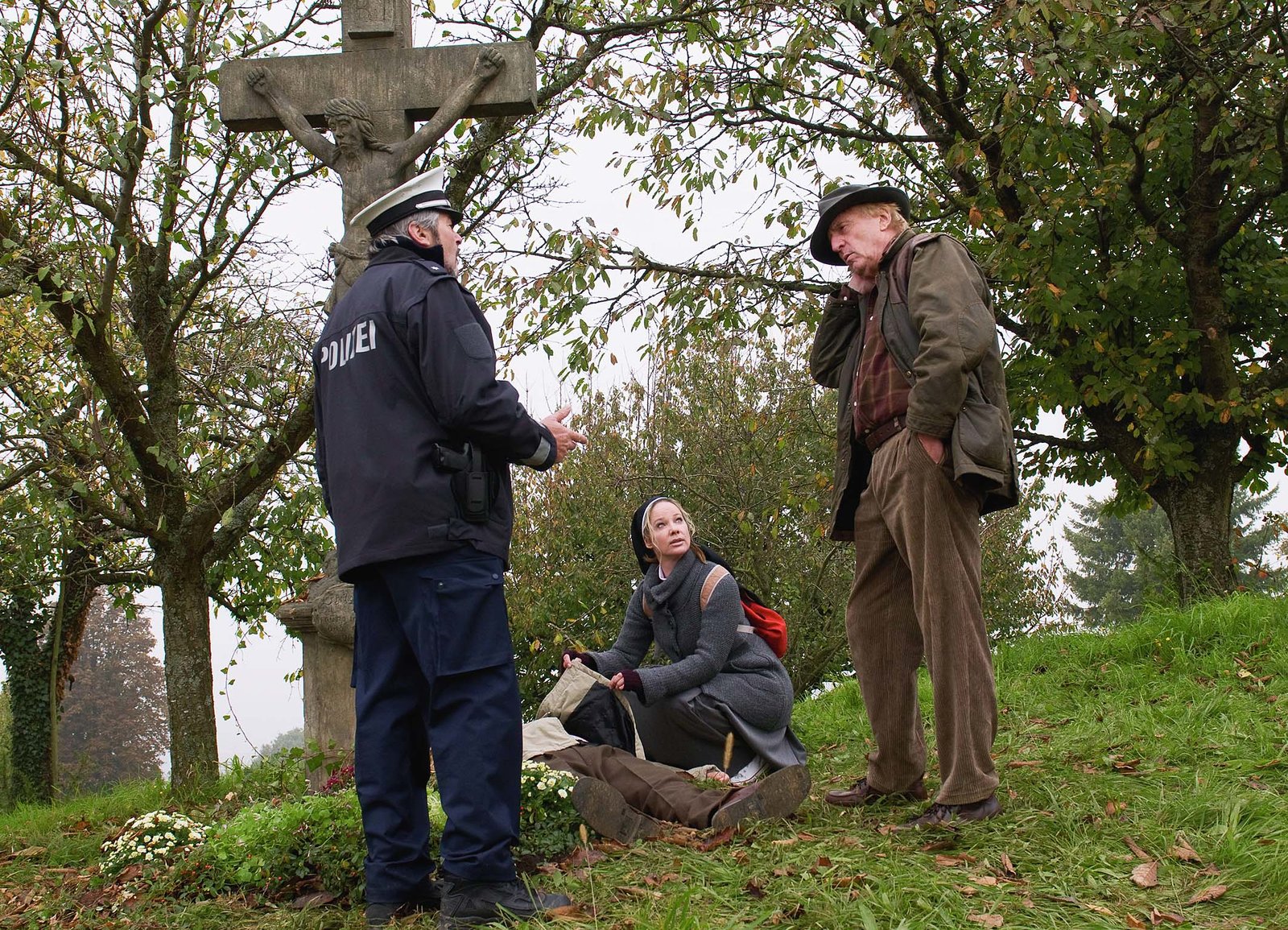 VerfluchtKommissar Baumert (Günter Maria Halmer, re.), Gerichtsmediziner Schmitter (Klaus Spürkel, Mitte) und Polizist Höfele (Horst Krebs, li.) besichtigen den Fundort der Leiche.Bild: © ORF