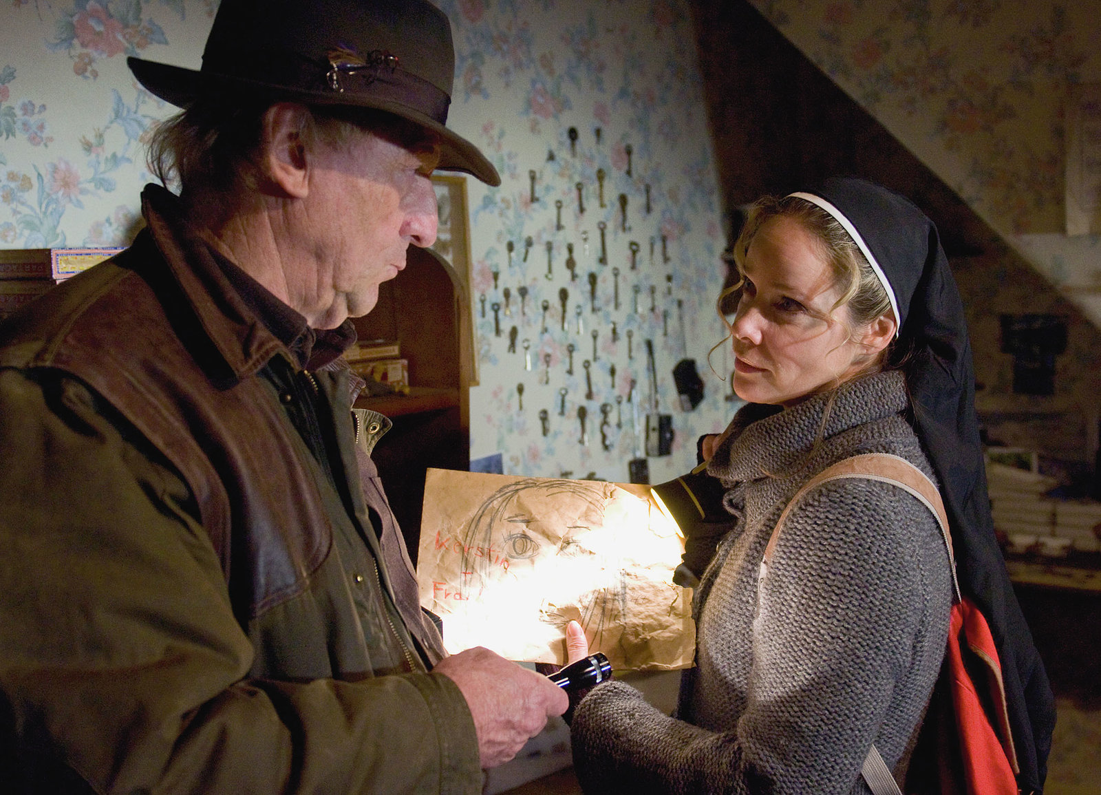 VerfluchtAm Tatort: Ann-Kathrin Kramer als Schwester Camilla (M.) , Günther Maria Halmer als Kommissar Josef Baumert (r.)Bild: © SRF/SWR/Johannes Krieg