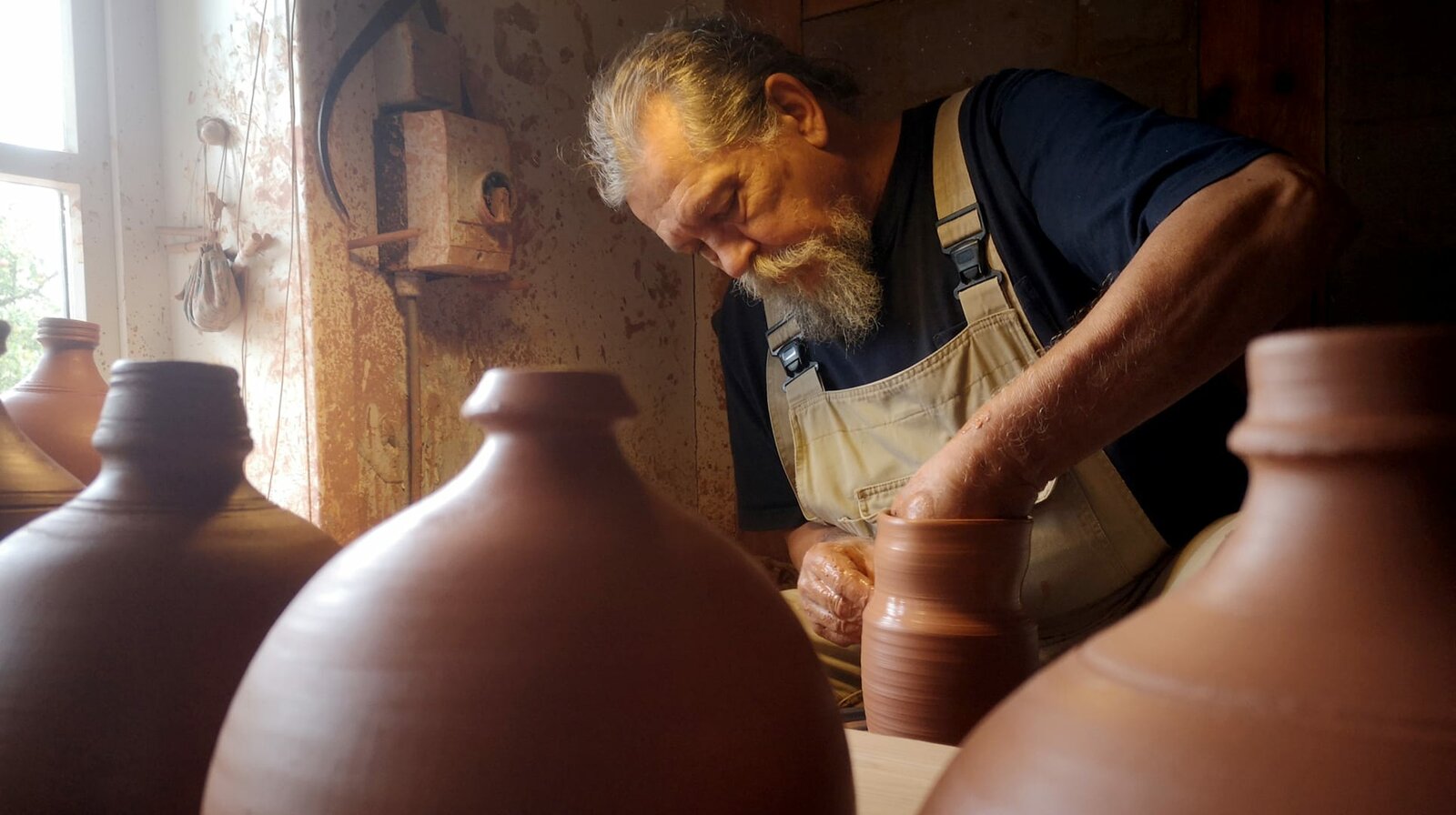 Johannes Klett-Drechsel in seiner Werkstatt. Er hat mehrerer Öfen in seiner Töpferei. Allein um den Holzofen voll zu bekommen, muss er drei Monate lang arbeiten.Bild: © NDR/Marco Schulze