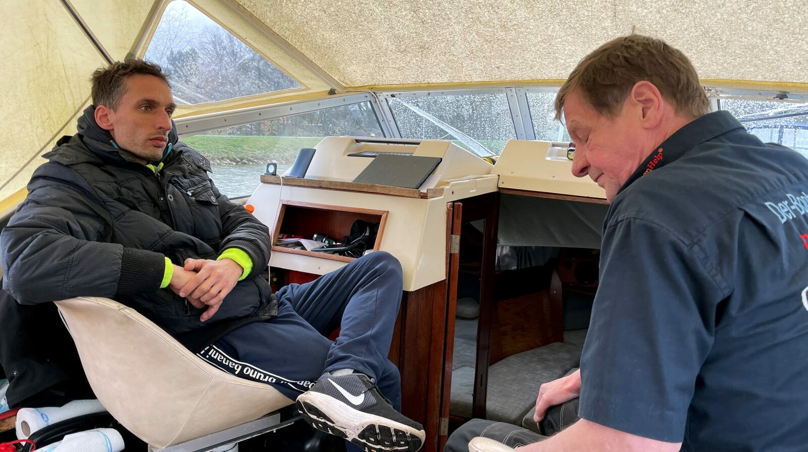 Krisengespräch: Für diesen Skipper (links) geht es erstmal nicht mehr weiter. Der Schaden ist zu groß - und wird vermutlich auch noch sehr teuer. Dabei hatte er das Boot gerade erst gekauft. (Bild: © NDR/lemon8