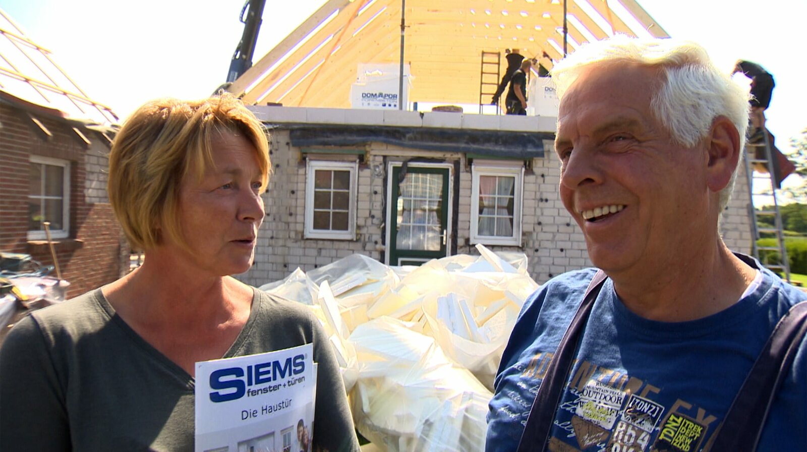 Johann und Monika Graver vor ihrem "neuen" Haus. Mittlerweile sind die Klinker abgeschlagen, das Dach ist so gut wie aufgestellt. Man sieht den beiden die Erleichterung an.Bild: © NDR