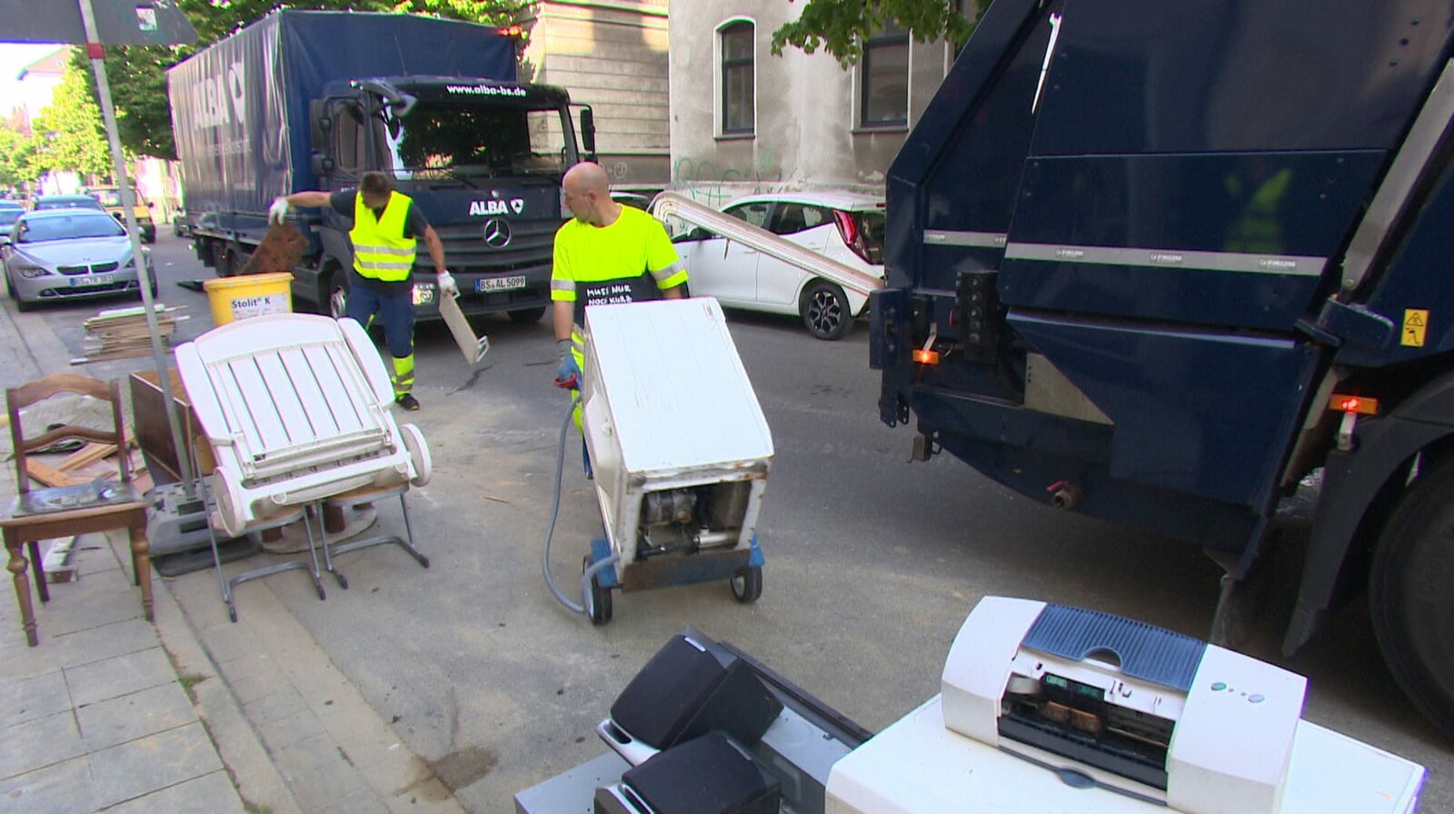 Mit einem zweiten Fahrzeug werden Elektrogroßgeräte eingesammelt. Kleinteile, Textilien und Bauschutt bleiben liegen. (Bild: © NDR/Filmblick Hannover/Florian Stege