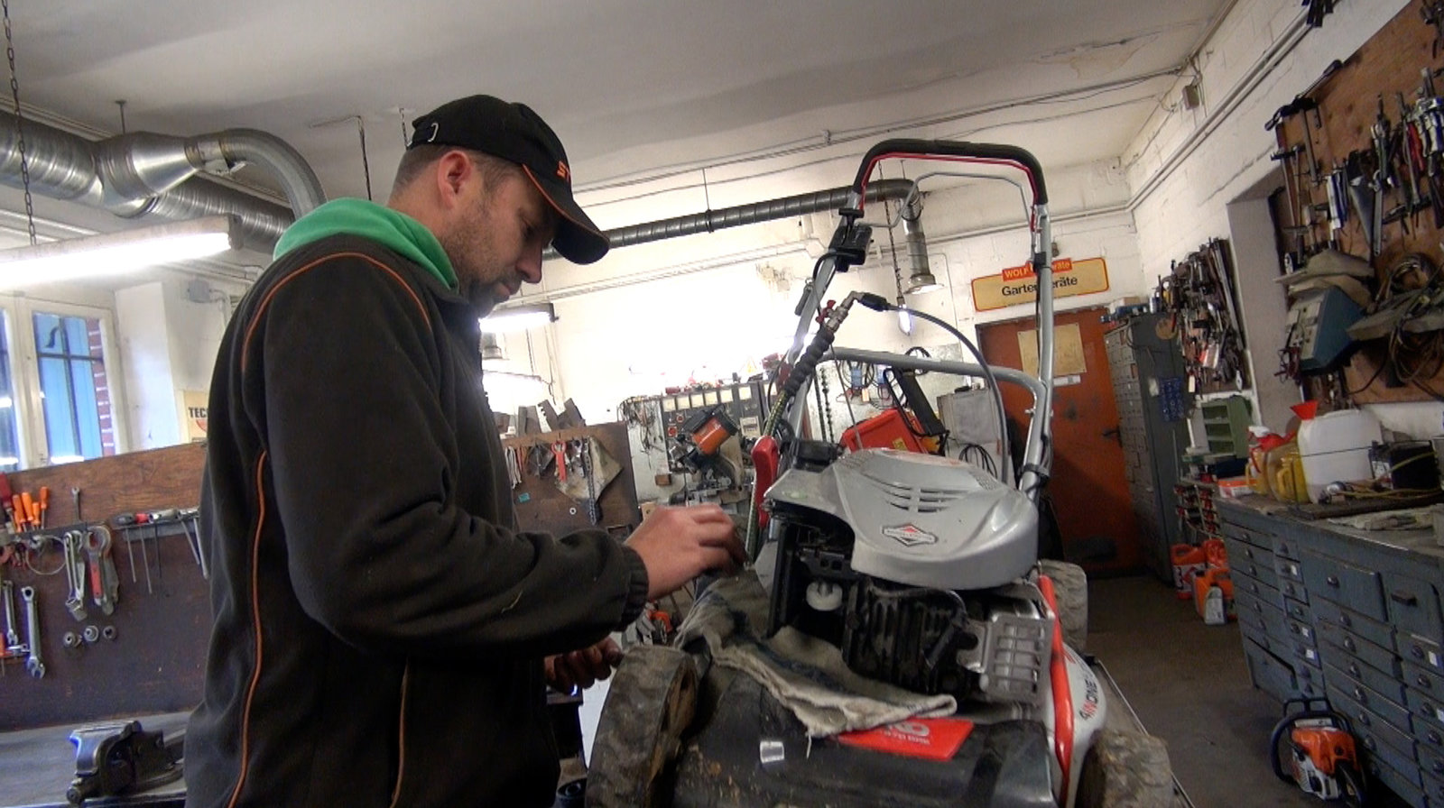 In der Werkstatt für Kleinmotoren gibt es vier Arbeitsplätze mit kleiner Hebebühne und Absaugungsanlage. Weitere Fotos erhalten Sie auf Anfrage.Bild: © NDR/Kick'n'Rush/daus:konzept GmbH